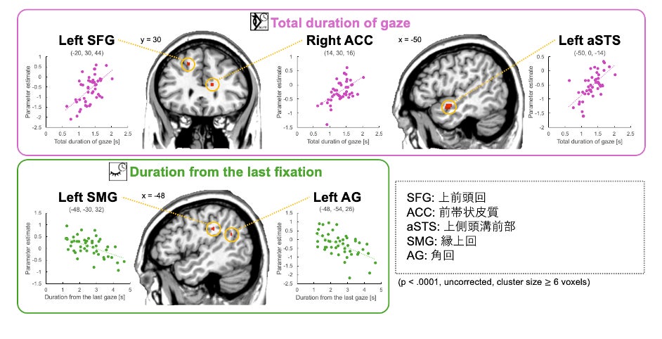 1.「安全運転が出来ていた急ブレーキが少ない参加者ほど、リスク車両を見た時間を合計するとトータルで長い時間注目していた」という関連が明らかになり、これらの参加者では状況の言語的・空間的な理解に関わる脳の領域(上側頭溝前部・上前頭回)、と適切な運転行動の選択に関わる脳の領域(前部帯状回)の活動が高くなっていることが分かりました。