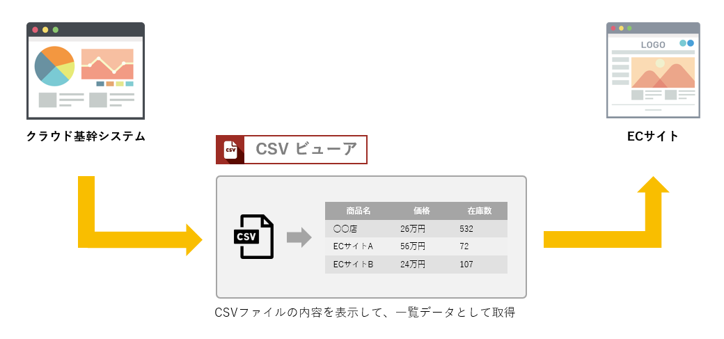 ・クラウド基幹システムからダウンロードした商品情報が記載されたCSVファイルを基に、ECサイト上の商品情報を更新する。
