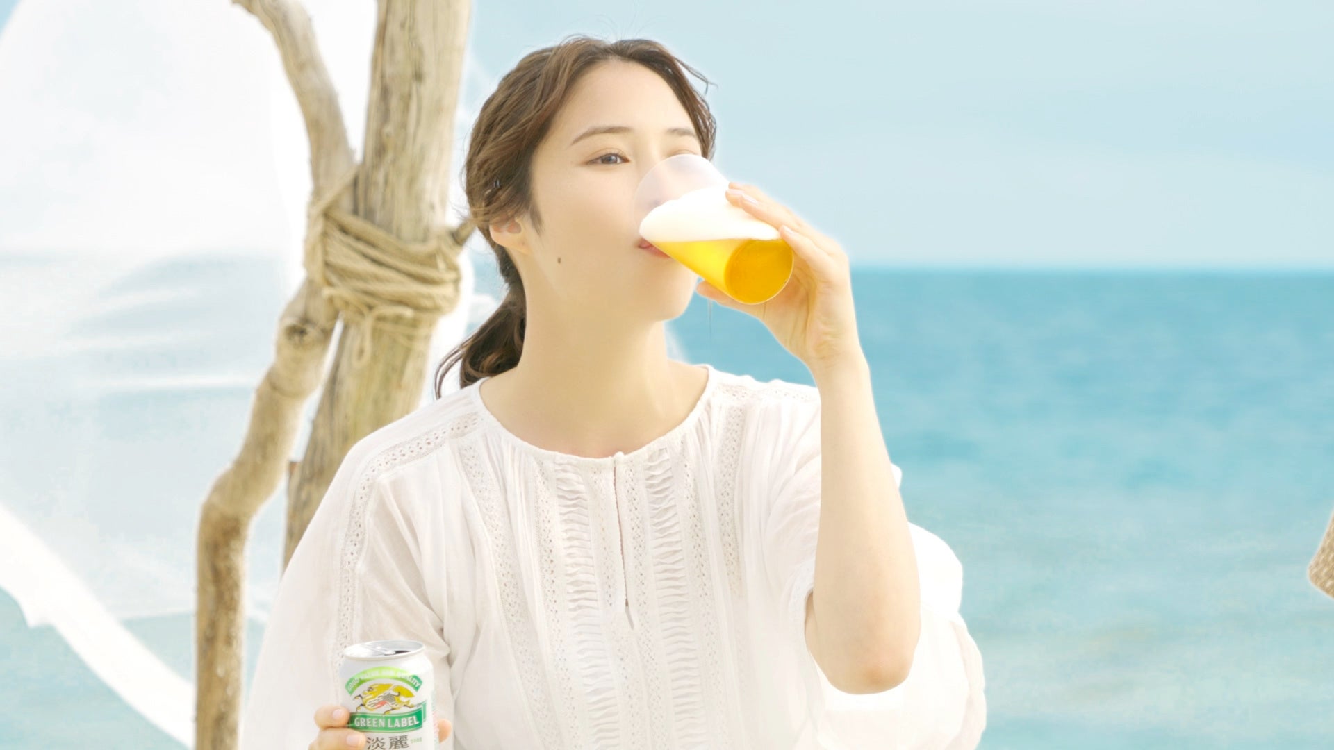 本作の舞台は、エメラルドグリーンに輝く海と、空が気持ちいい離れ小島。きらめく日差しの中、爽やかな風が吹く海辺であいみょんさんが弾き語るのは、大人気楽曲「裸の心」のアコースティックバージョンです。気持ちのいい歌声を聴きながら、「淡麗グリーンラベル」の爽やかなおいしさを楽しむ広瀬さん。爽やかな風を感じながら「淡麗グリーンラベル」をおいしそうに飲み、ココロもカラダも気持ちいい時間を過ごす広瀬さんの笑顔と、開放的な世界の中で歌うあいみょんさんの気持ちいい歌声が、とても印象的なTVCMとなっています。
