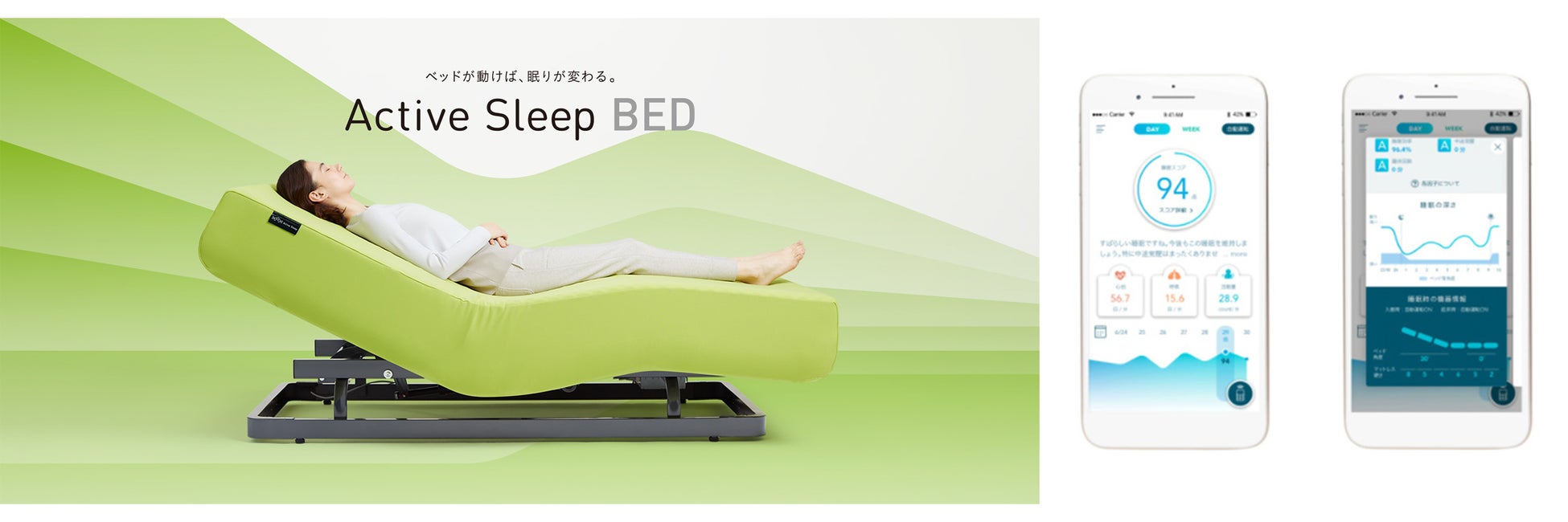 「Active Sleep BED」は、眠りやすい角度「入眠角度」を新提案しているベッドで、入眠をサポートする様々なポジションが可能です。その日の体調に合わせ眠りかたを変えられ、眠ったことを感知するとベッドが自動運転し、熟睡やすっきりとした目覚めを促します。スマートフォンに専用アプリ入れることで、IoT家電連携や眠りの状態の採点とアドバイスなども可能となっています。