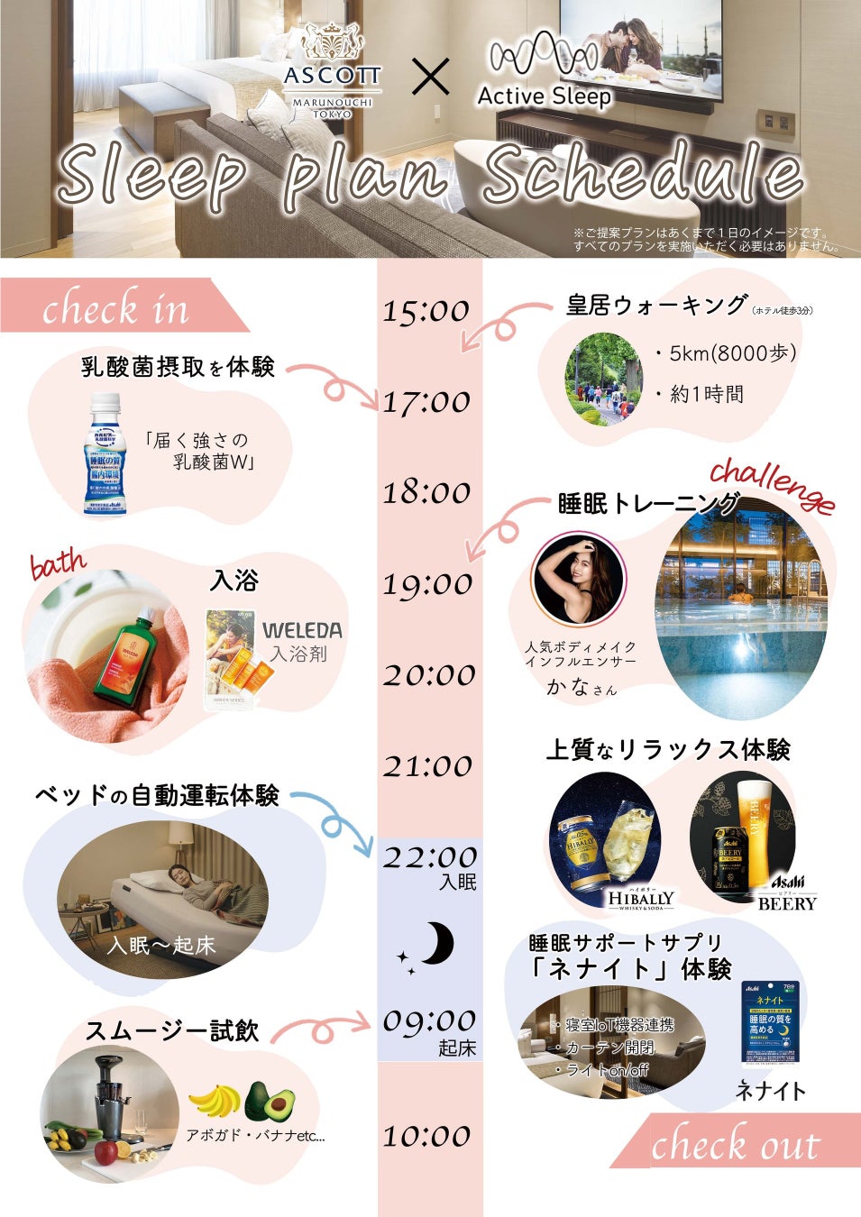 【「Active Sleep BED体験宿泊プラン」スケジュールとアメニティ】