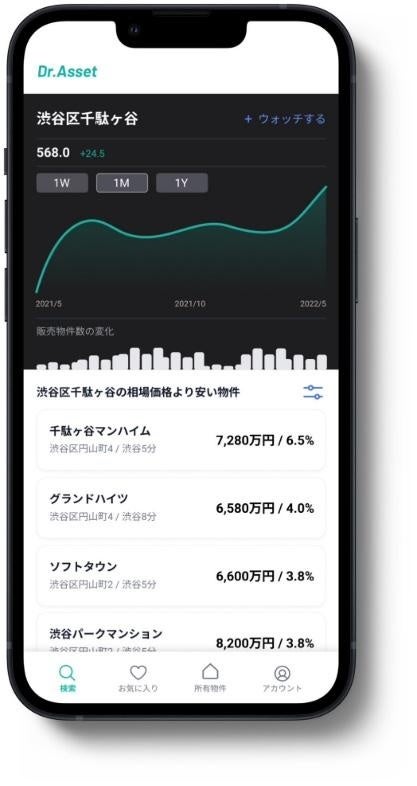 そして、リアルタイムの正確な査定結果を、月足・年足などの粒度でチャート化して可視化することで、株などの金融資産と同様に、不動産資産の値動きを目で追うことが可能になります。