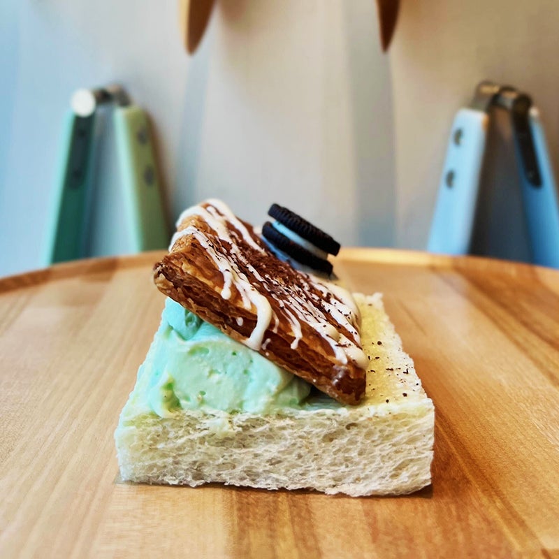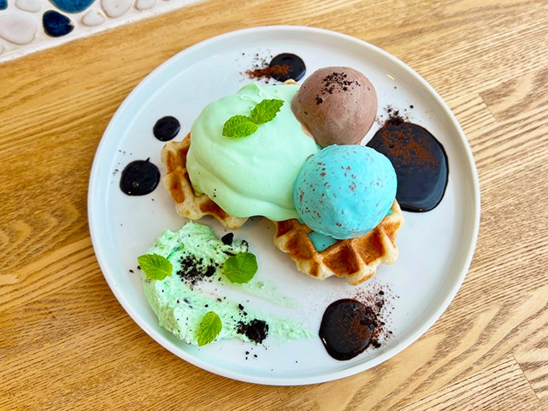 人気食パン「ムー」の生地ををワッフル型で焼いた「ムッフル」。ミントクリーム、チョコミントアイス、チョコアイス、チョコミントマスカルポーネクリーム、を合わせました。チョコとミントをふんだんに使用しておりチョコミント好きにはたまらないワンプレート。清涼感も感じられるミントの風味はこの季節にぴったり!濃厚チョコレートとの相性も抜群です。