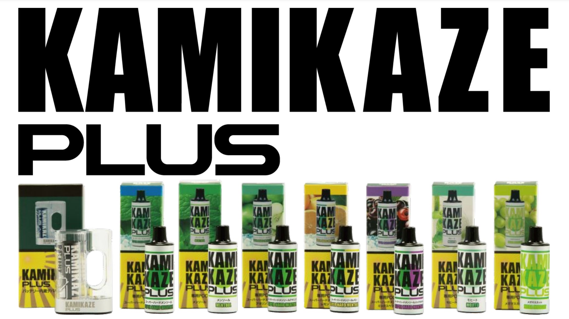 「KAMIKAZE PLUS」は、「KAMIKAZE e-juice」を使用したKAMIKAZE VAPEシリーズの最新モデル商品として登場しました。「KAMIKAZE e-juice」は 国内電子ベイプのリキッド市場を牽引してきたブランドで、日本の食品基準最高グレードを満たす原材料で、日本人の好みを体現する安心安全な国産リキッドです。