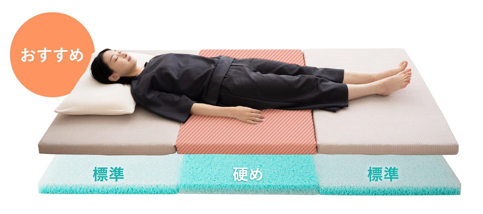 ダブル3Dファイバーは肩・腰・脚部分で3分割されています。例えば、腰の部分のみを裏返すことで、体重が最もかかる腰をしっかり支えて、腰を沈み込みにくくすることができます。