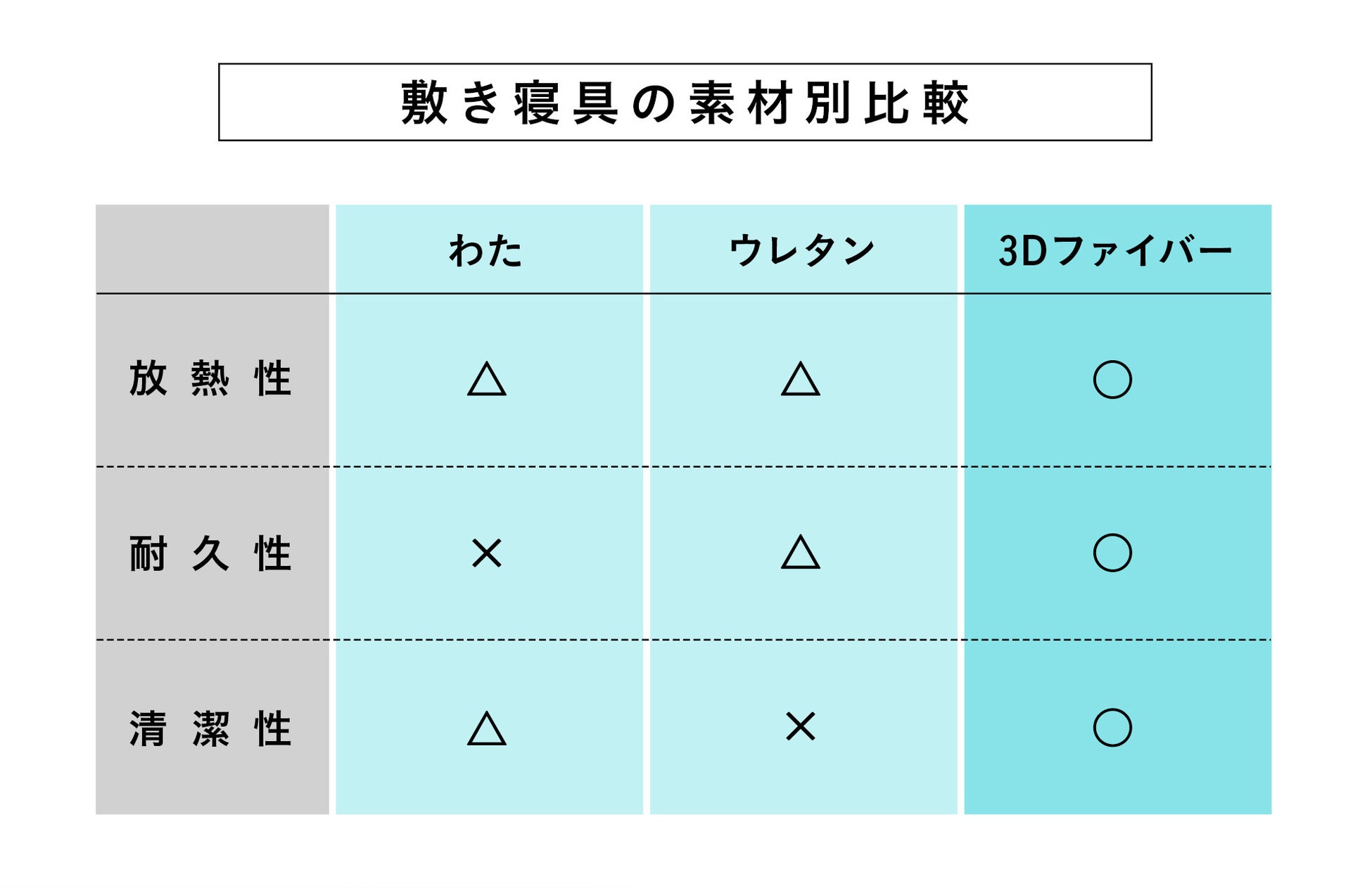 3Dファイバーはわたやウレタン素材の寝具よりも、体温調節しやすく、頑丈な素材です。また、ダニやカビが発生しにくい素材なのでハウスダストやアレルギーをお持ちの方にも安心して使用できます。