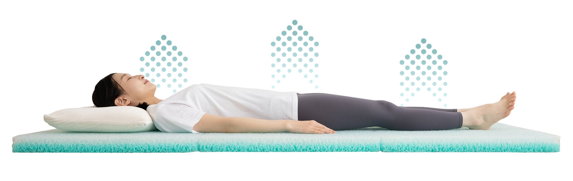 通常私たちは一晩に20回程度の寝返りを繰り返すと言われています。寝返りには身体の一部に負荷がかからないようにしたり、体温調節をする役割があります。3Dファイバーは非常に高い反発力があり、無理な力を入れなくても全身がスムーズに寝返りがうてるようになり、睡眠中のエネルギー消費を最小限に抑えることで、朝まで快適に眠れることが期待できます。