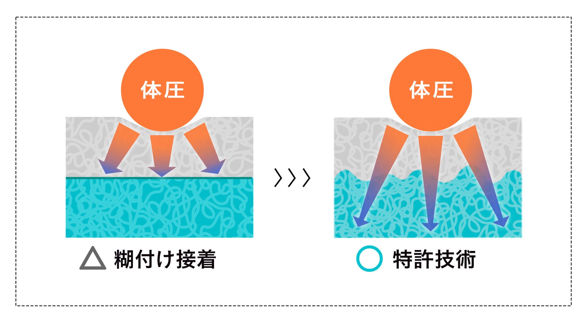 従来品は特性の異なる素材を組み合わせる時、糊や熱で接着しています。独自の特許技術により、2つの特性の相乗効果を生み出すことに成功しました。