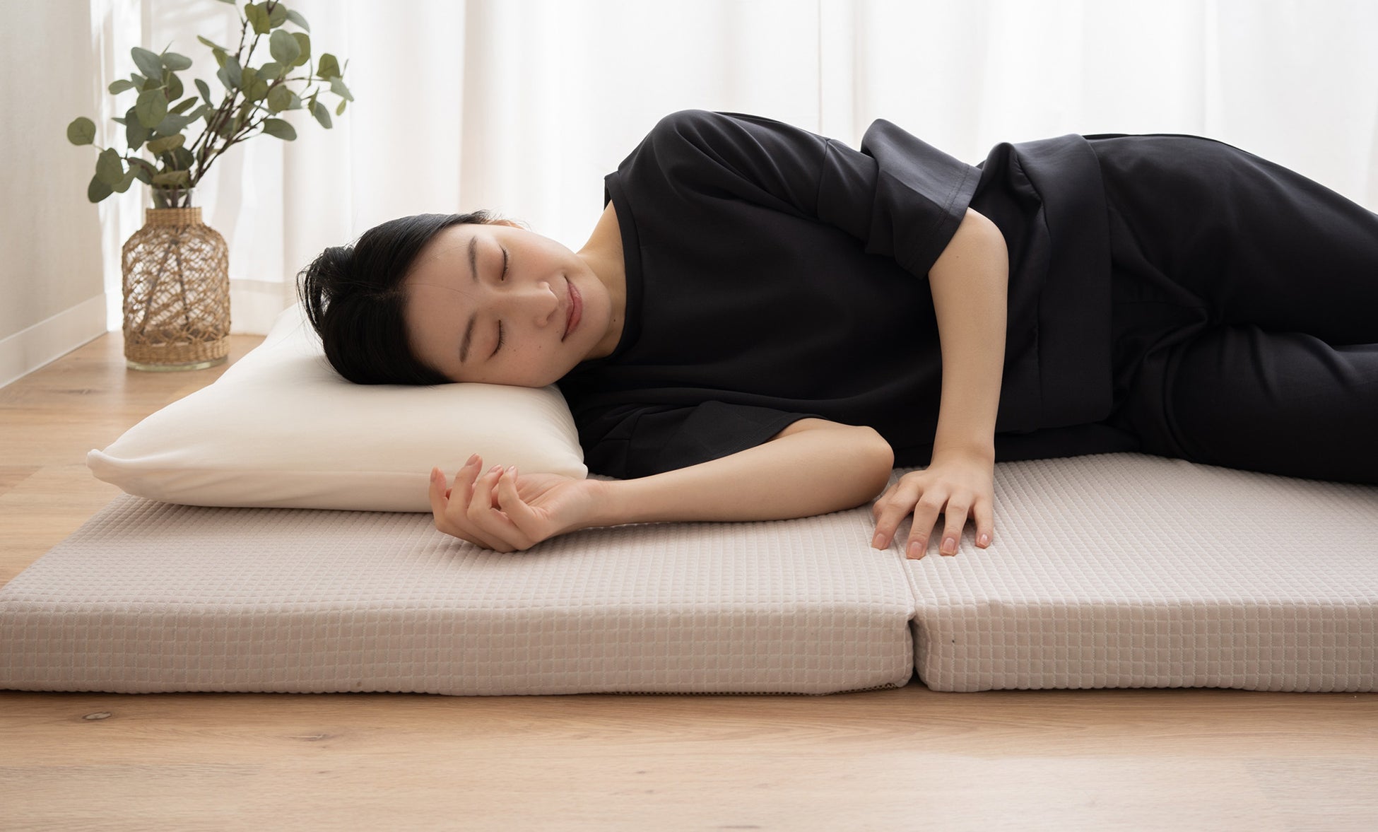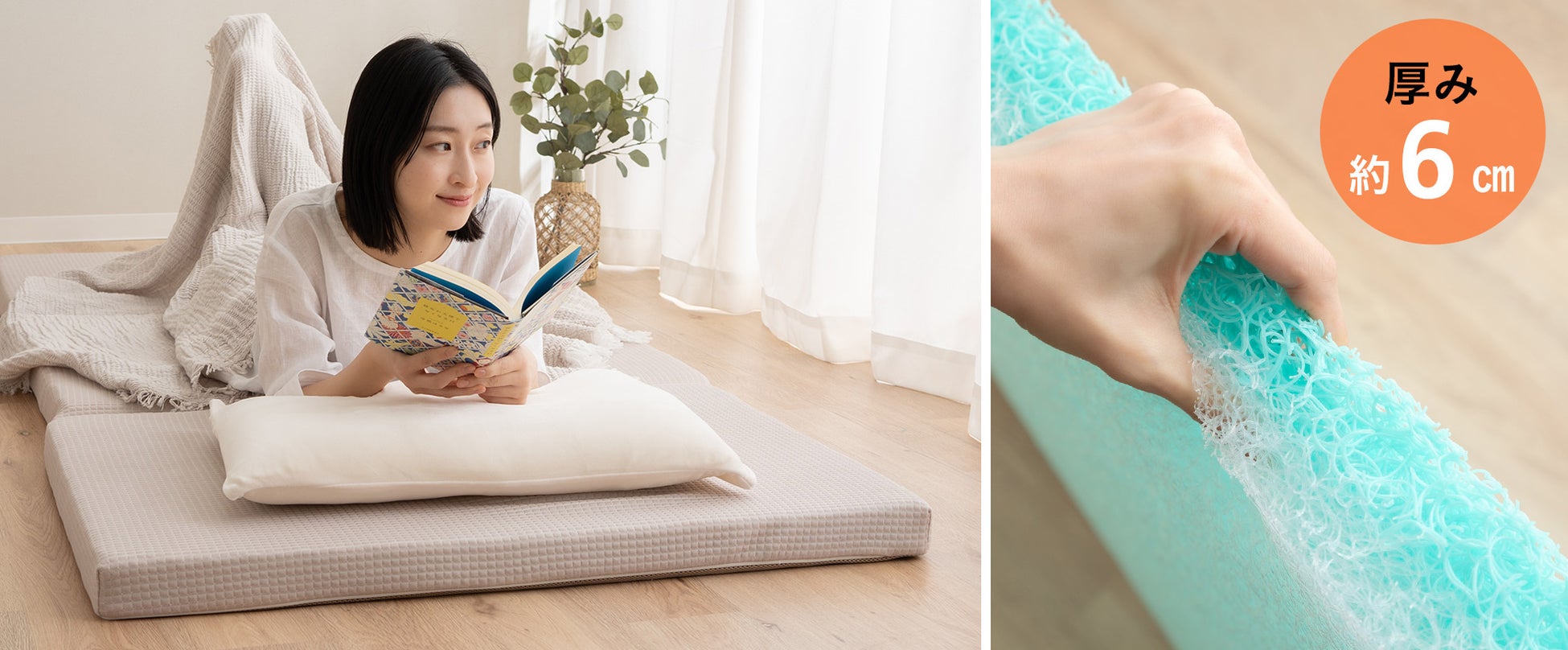 上層が身体の凹凸を埋めて、下層がしっかり身体を支える。厚さ6cmと聞くと薄く感じるかもしれませんが、ダブル3Dファイバーならこの厚みで十分すぎるほどの寝心地です。