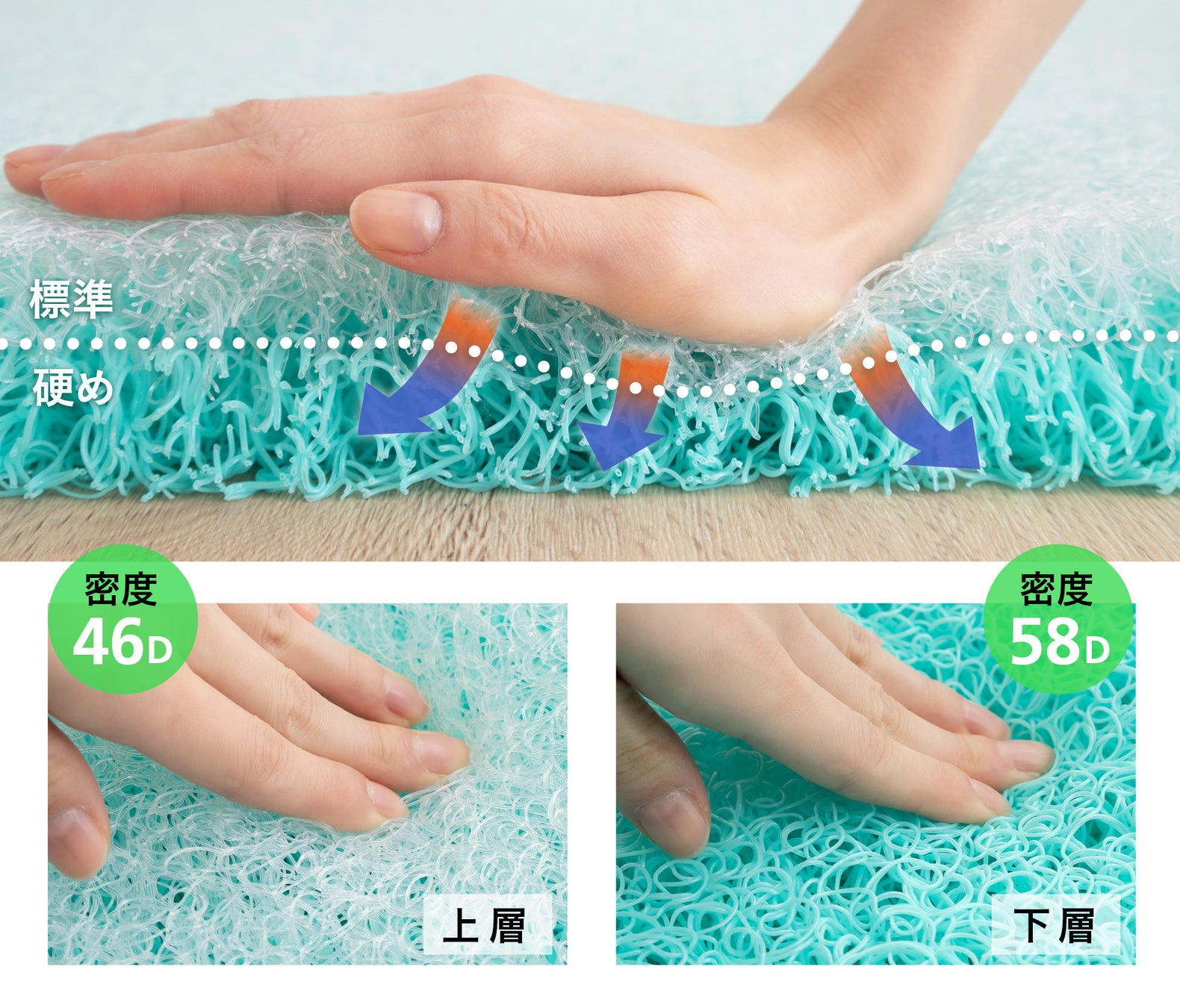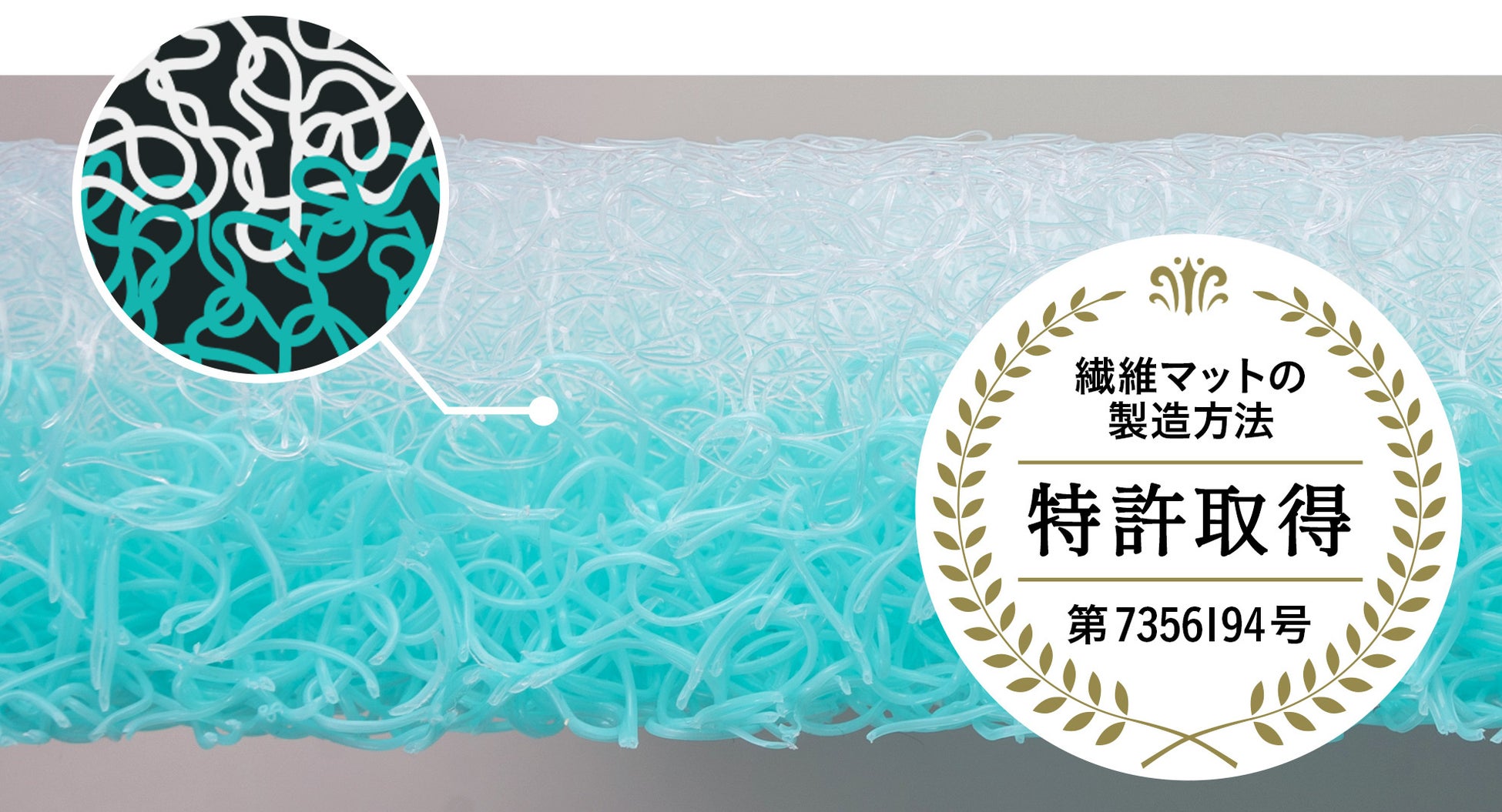 中材は密度の異なる3Dファイバーの2層構造。2層は糊付け接着ではなく、ファイバー同士を絡み合わせながら繋いだ特許技術の構造により、従来品より優れた体圧分散性を実現。