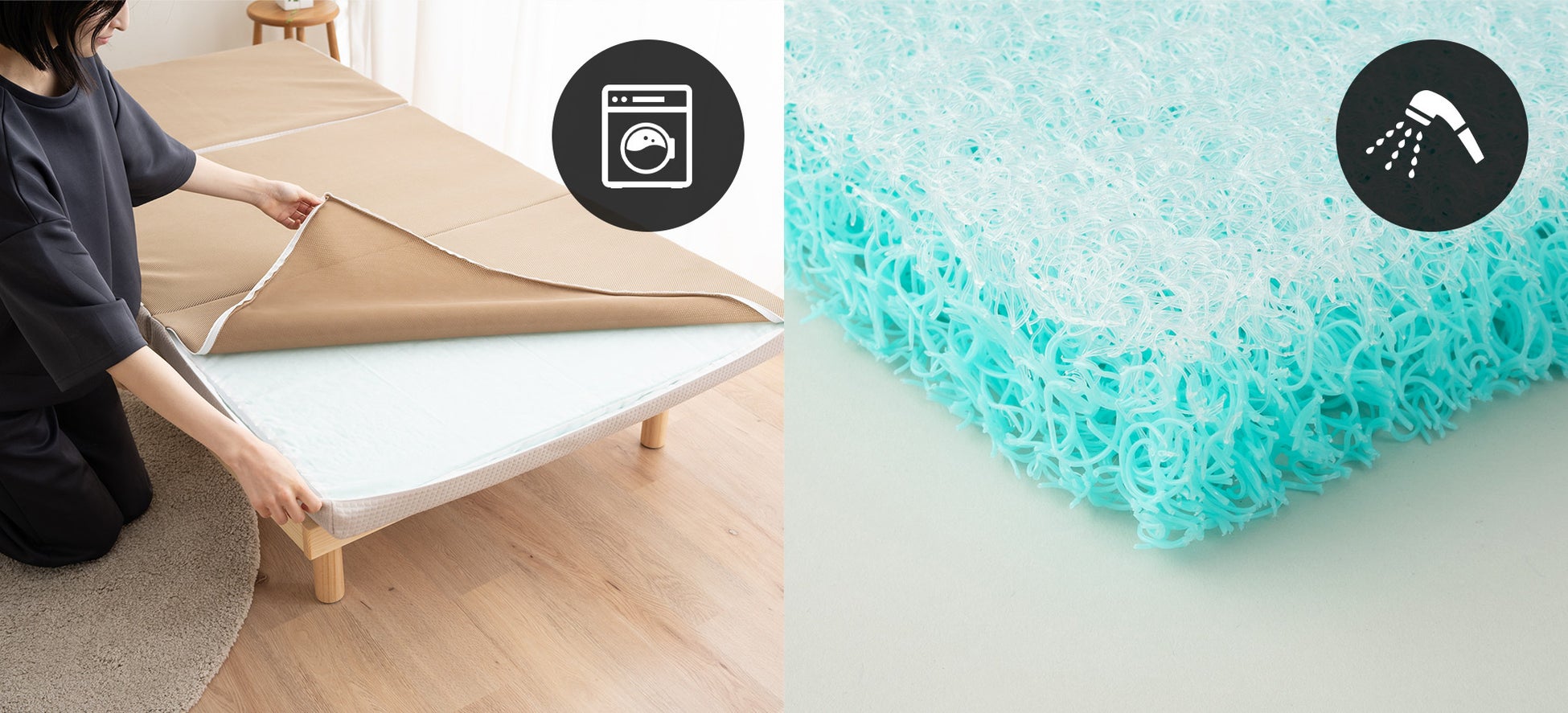 夏は付属のカバーそのまま、または薄いシーツの使用でマットレスの中に空気の流れが出来て、涼しく快適。冬は厚手のシーツや敷きパッドを使用いただければ、空気層に熱を溜めてあたたかくご使用いただけます。