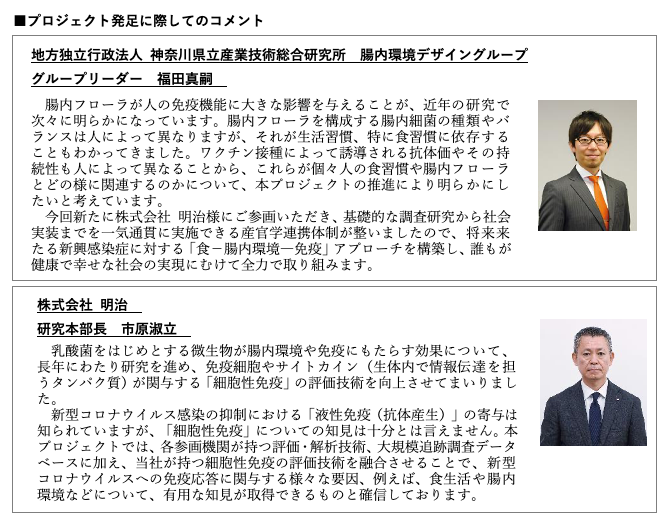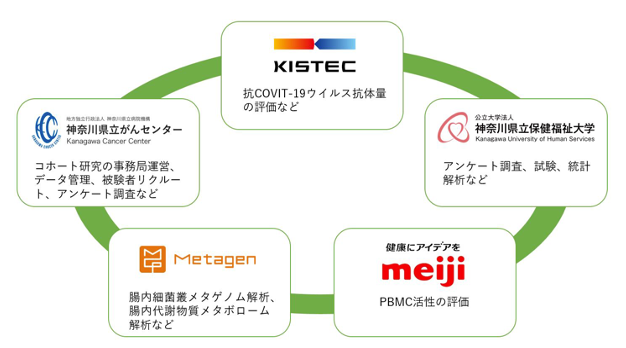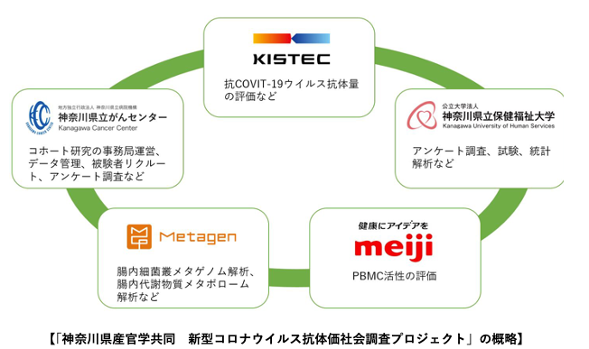 地方独立行政法人 神奈川県立産業技術総合研究所(以下、KISTEC)が中心となって、公立大学法人 神奈川県立保健福祉大学、地方独立行政法人 神奈川県立病院機構神奈川県立がんセンター、株式会社 メタジェンと進めている新型コロナウイルス抗体保有者の生活習慣や腸内環境の調査に関する共同研究に、乳酸菌をはじめとする微生物が腸内環境や免疫機能にもたらす影響についての知見を有する株式会社 明治(代表取締役社長:松田 克也、以下、明治)が参画し、産官学連携による共同研究として「神奈川県 産官学共同 新型コロナウイルス抗体価社会調査プロジェクト」がスタートします。