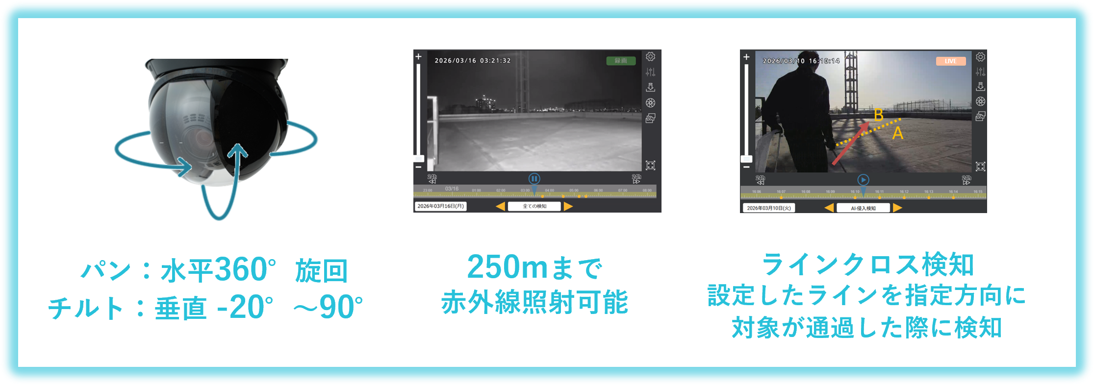 ・パン(水平360°旋回)、チルト(垂直 -20°~90°)に対応