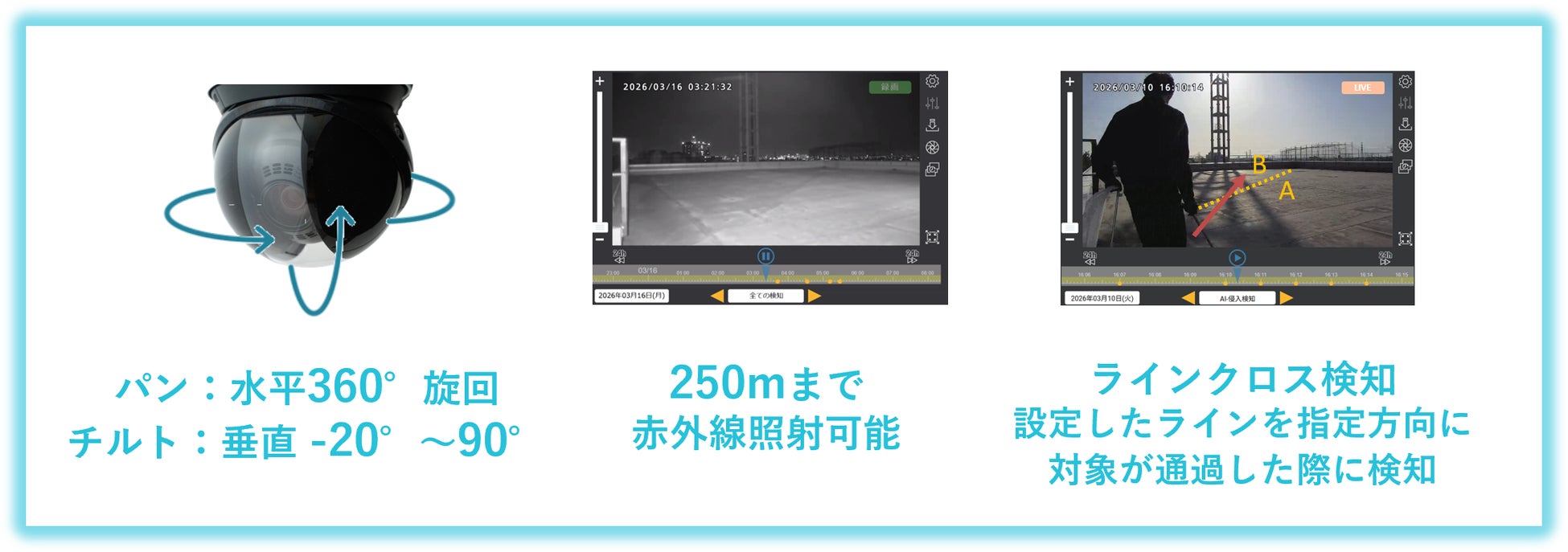 キッズウェイでは「夜間・暗所でも“確実に視認できる”こと」と「異常兆候の早期発見」を両立できるカメラを求める声が多数寄せられていました。これらの課題を解決すべく、広範囲の遠距離監視に優れた赤外線PTZに加え、AIによる自動検知を搭載した新モデルを開発いたしました。