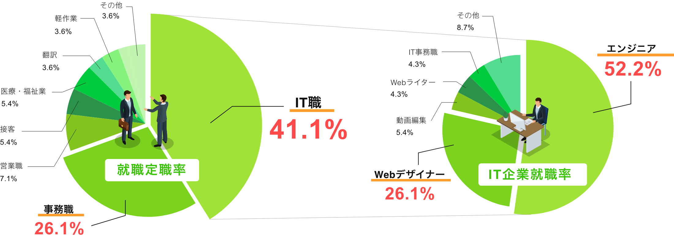 就労移行ITスクール全体では、卒業生の約41%がIT企業に就職、職場定着率が94%という実績もございます。これは他社事業所と比較しても高い割合です。