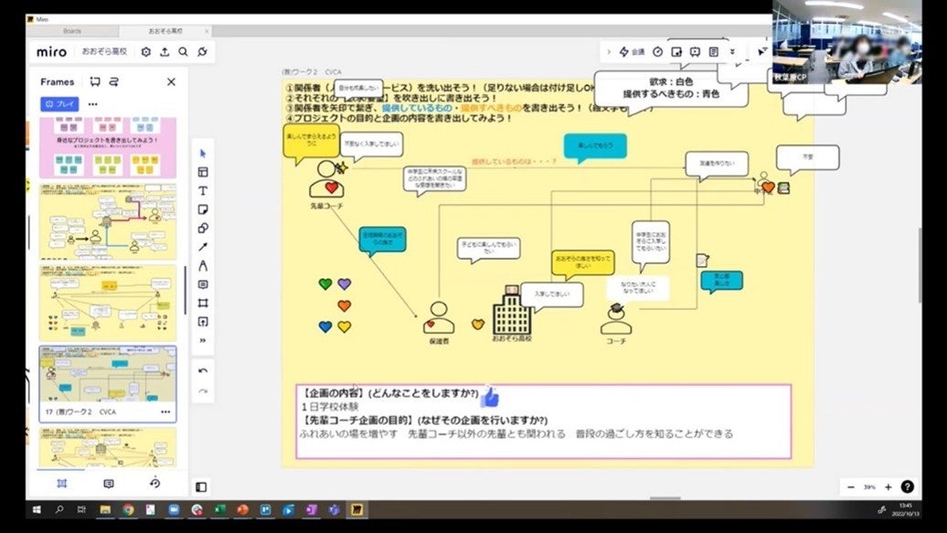 授業は、先輩コーチ(※)という役割を担う生徒を対象に、「プロジェクトとは何か?」「プロジェクトマネジメントとは何か?」「プロジェクトを企画してみよう!」という内容で、オンラインホワイトボードを用い、どんなステークホルダーにどんな価値を届けるのかについてグループワーク形式で協創する授業を開催しました。