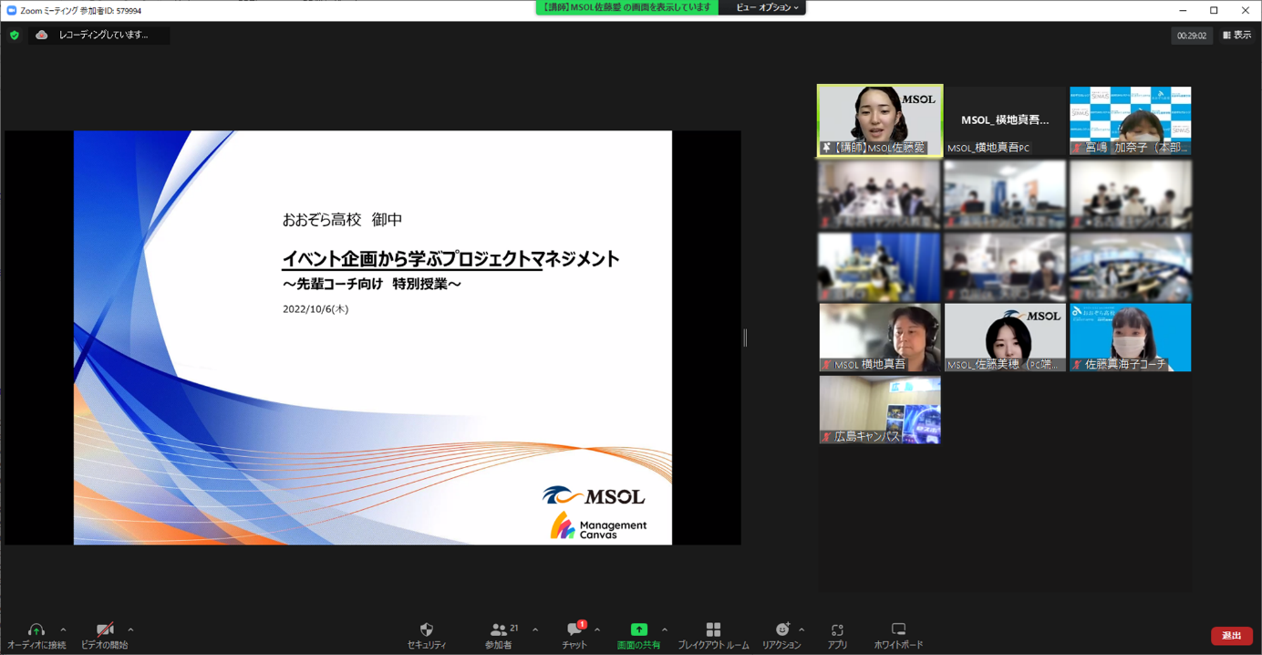 おおぞら高校は、「なりたい大人になるための学校®。」を理念に掲げ、生徒が様々な大人と接する機会を創出しています。これまでもさまざまな企業とコラボレーションし、生徒がなりたい大人を見つけるための環境を多く提供しているおおぞら高校の理念に共感し、オンライン授業という形でご支援することになりました。MSOLの主事業である「プロジェクトマネジメント」をテーマにした授業では、生徒の人生や学校生活をプロジェクトに見立て、人生及び学校生活に目的をもって計画的に過ごすことができる内容としました。