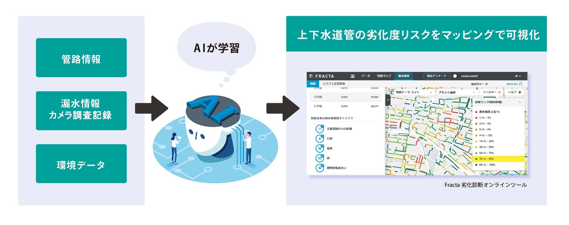 世界で初めて開発したAIと環境ビッグデータを活用した水道管の劣化診断技術(特許第7585041号)は、水道管の物理的・化学的劣化に関わる埋設環境データおよび管路情報、漏水情報を使用するだけで、掘削して管体を直接確認することなどせずに、将来の劣化リスクを高精度に把握することが可能。2015年の米国・シリコンバレーでのFracta創業、2019年の日本法人(Fracta Japan)の設立以来、国内外で事業展開しており、現在までに日本約60、世界約150以上の事業体にて採用されています。