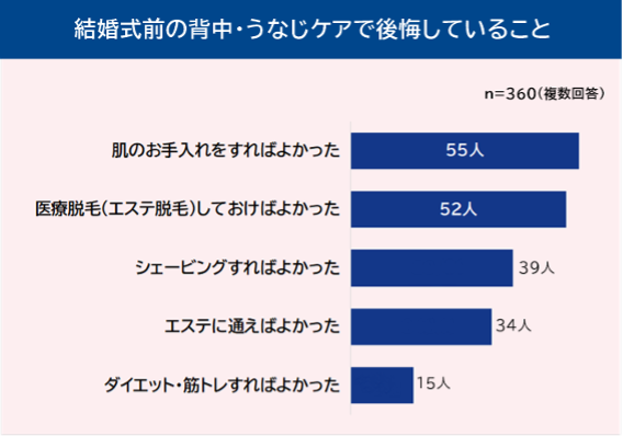 - 結婚式前の背中&うなじケアで後悔していることは「肌のお手入れ」「脱毛」をすればよかった