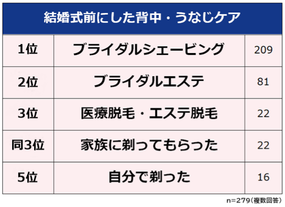結婚式前に何らかの背中・うなじケアをしたと回答した279人に「どんなケアをしたか」聞いたところ、最も多かったケアの内容は「ブライダルシェービング(209人)」でした。
