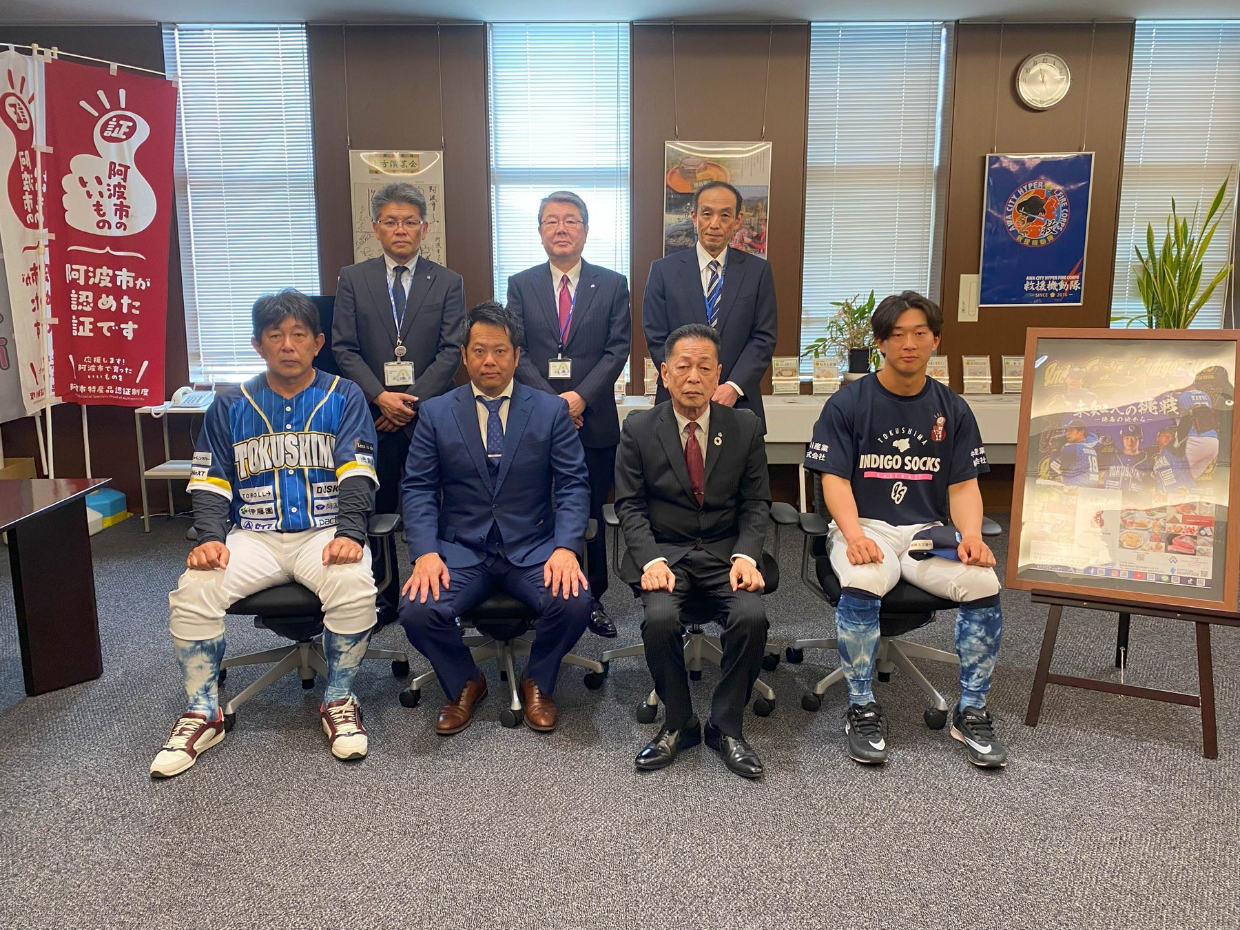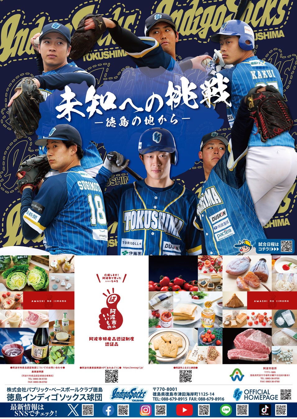 阿波市様には、いつも私たち選手が練習で着用しているオフィシャルTシャツやポスターなどの取り組みにご協力いただき、インディゴソックスは阿波市の野菜の広報活動にご協力させていただいております。