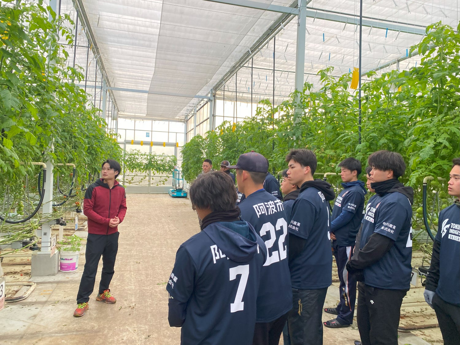 新人合同自主トレでは、選手がトマト収穫の施設見学をさせていただきました