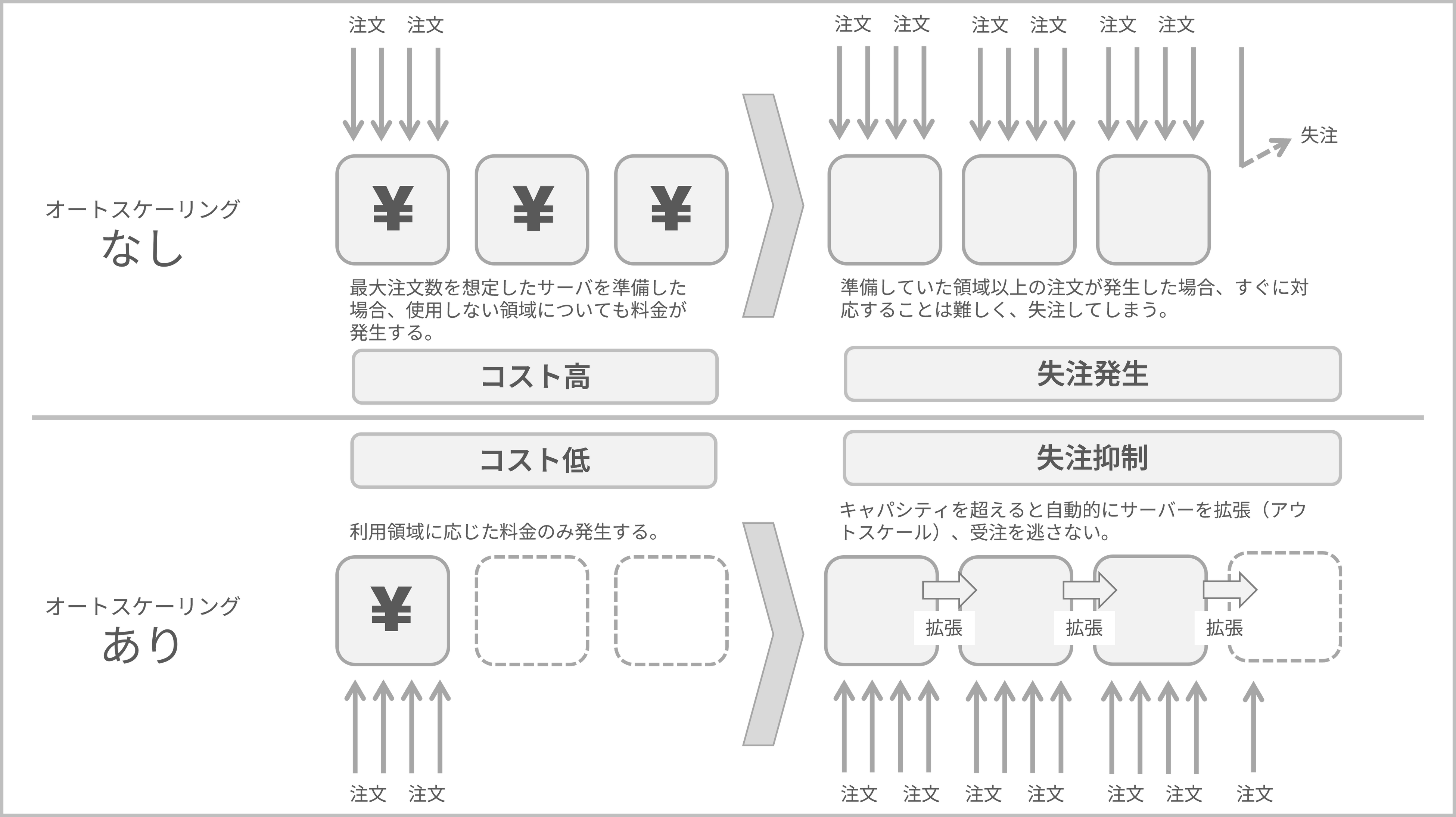 通常の運営時から、最大受注時を想定したサーバ環境を設定すると、コストの負担も高くなります。また、準備した以上の注文が発生した場合にもフレキシブルな対応が難しく失注が発生してしまいます。