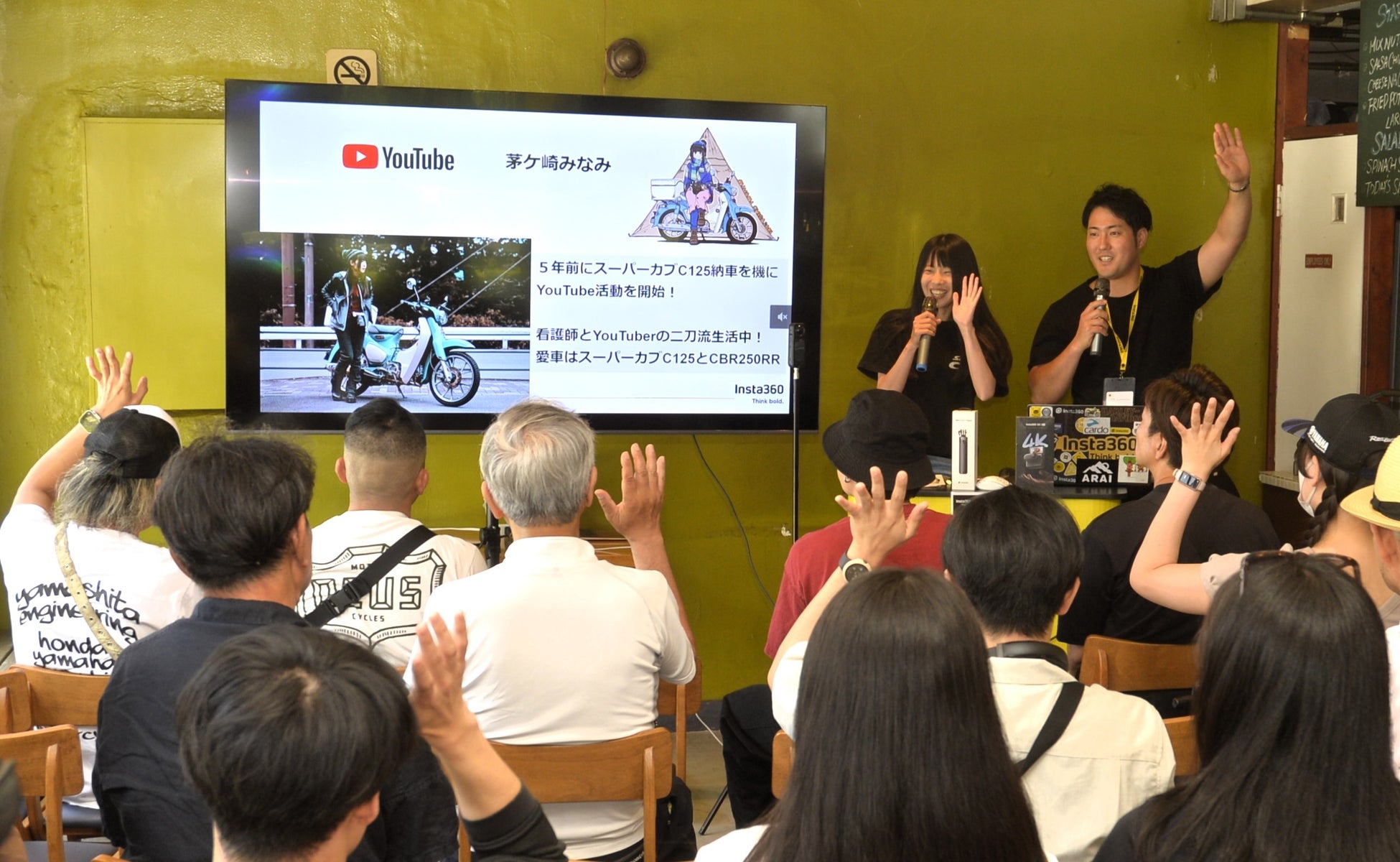 最初のセッションでは、大人気バイク系女子YouTuber 茅ヶ崎みなみさんに登壇いただき、Insta360の社員との対談形式で「Insta360のあるバイクライフ」をテーマに語っていただきました。茅ヶ崎さんの自己紹介から始まり、普段どのようにInsta360のカメラを使っているのか、Youtubeの動画での使用シーンなどを実際に見せていただきながら、カメラのバイクへのマウント方法、動画の編集方法等もご紹介いただきました。