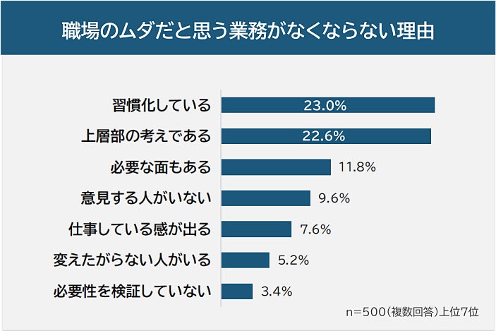 「ムダだと思う業務がなくならないのはなぜだと思うか?」という質問の回答で最も多かったのは、「習慣化している(23.0%)」でした。僅差の2位は「上層部の考えである(22.6%)」となっています。