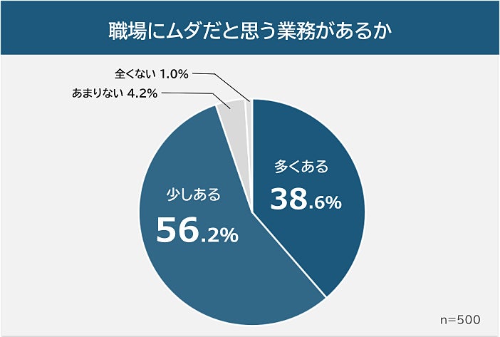 お仕事をしている500人に「職場でムダだと思う業務があるか」を聞いたところ、「多くある(38.6%)」「少しある(56.2%)」が合わせて94.8%にのぼりました。