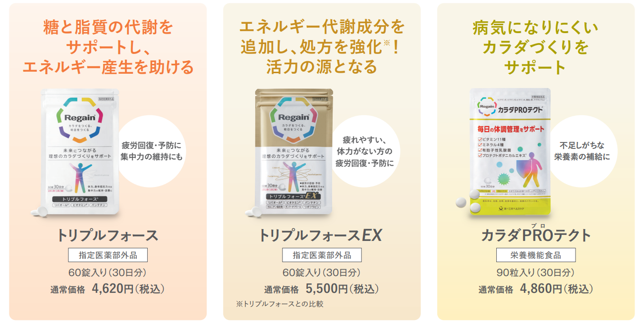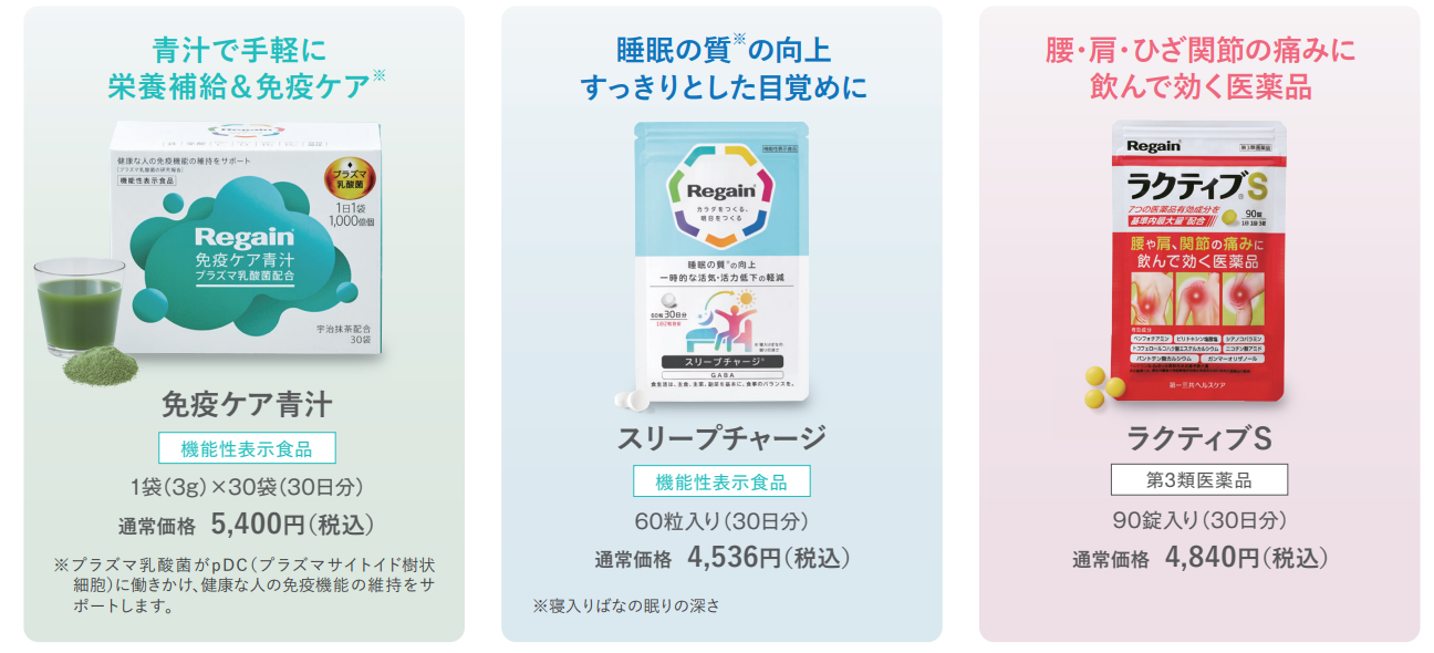 リゲインのブランド名は、「Re(再び)+gain(獲得する)」から、疲れた身体に再びパワーを与え「取り戻す」というメッセージが込められています。1988年に誕生した「Regain」は、「再び元気になる」というコンセプトのもと、 バブル全盛期「24時間戦えますか。」のキャッチコピーでドリンク剤を発売してきました。時代の変化とともに、「再び元気になる」というコンセプトはそのままに、 「カラダをつくる、明日をつくる」のキャッチコピーで人生100年時代に寄り添うブランドとして、ドリンク剤だけではない様々な商品をご提供しています。