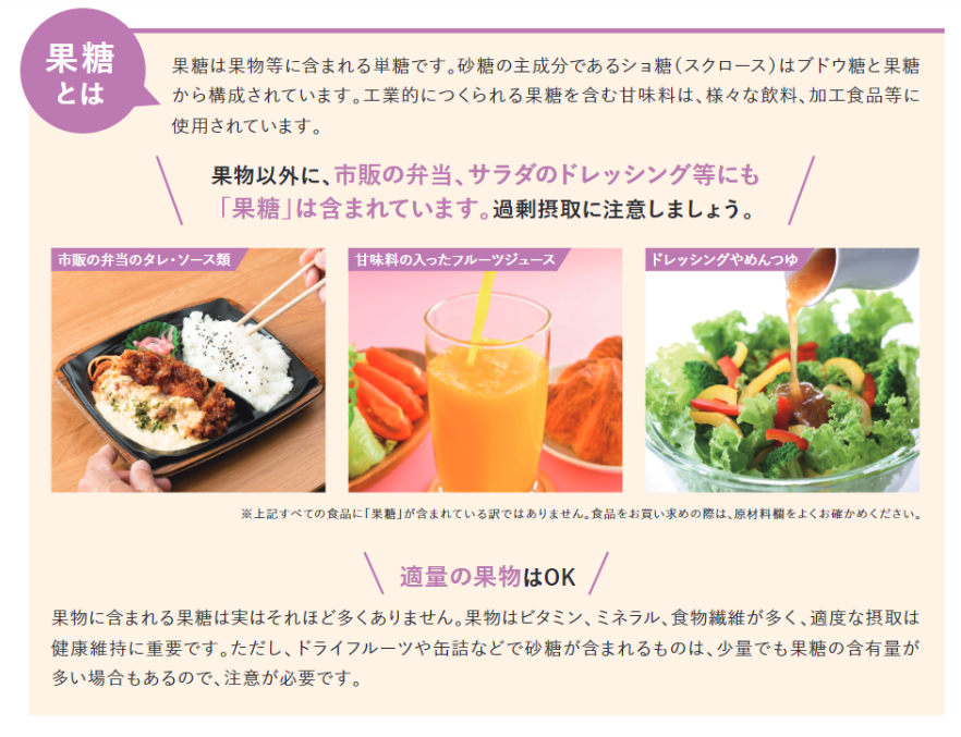 果物以外に、市販の弁当、サラダのドレッシング等にも「果糖」は含まれています。過剰摂取に注意しましょう。