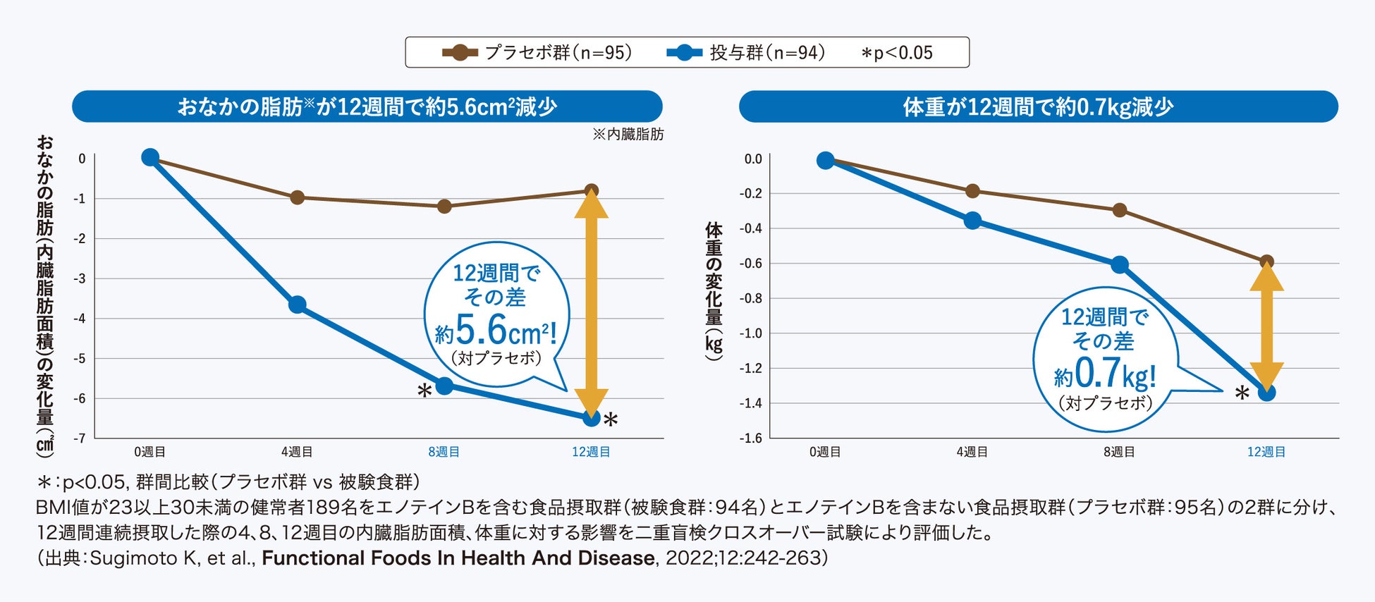 届出表示:本品にはエノテインBが含まれます。エノテインBは、BMIが高め(BMI 23以上30未満)の方のおなかの脂肪(内臓脂肪)を減少させ、体重の減少をサポートすることで、高めのBMIの改善に役立つ機能があることが報告されています。