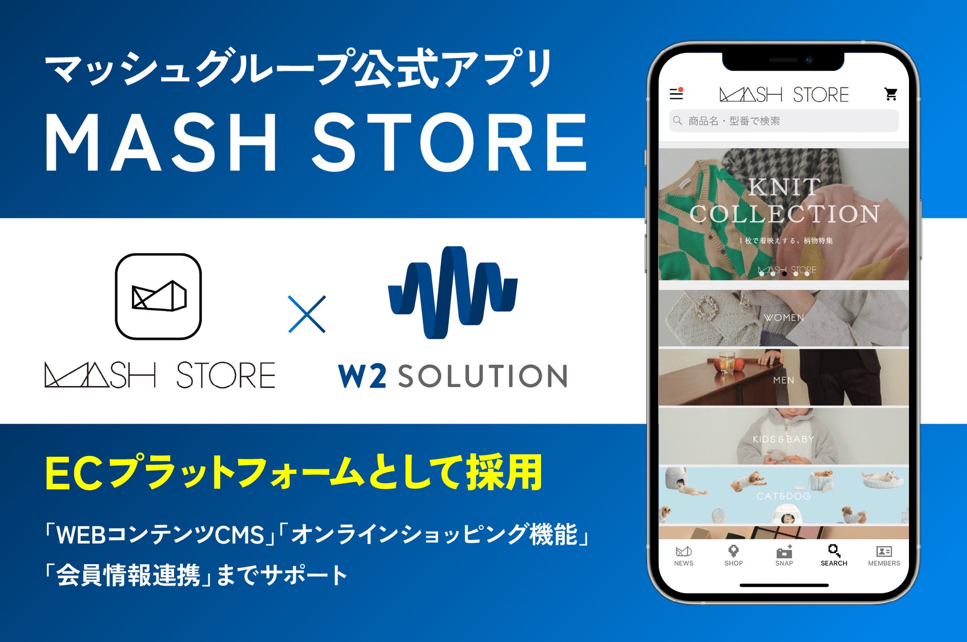 様々なビジネスサイズや商材カテゴリを幅広く対応する高機能ECプラットフォームを提供するw2ソリューション株式会社(本社:東京都中央区、代表取締役CEO:山田 大樹)は、オムニチャネル対応型総合ECプラットフォーム「w2Commerce」が株式会社マッシュホールディングス(本社:東京都千代田区、代表取締役社長:近藤広幸)のマッシュグループ公式アプリ「MASH STORE(マッシュ ストア)」のWEBコンテンツCMS(コンテンツマネジメントシステム)やオンラインショッピング機能などのECプラットフォームとして採用されたことを発表します。「MASH STORE」にてファッションブランドのSNIDEL(スナイデル)やgelato pique(ジェラート ピケ)、トータルビューティブランドのCelvoke(セルヴォーク)などマッシュグループ全23ブランドを横断して買い物ができる環境を構築し、マッシュグループのブランド間のシナジー創出をECプラットフォームとしてサポートしております。