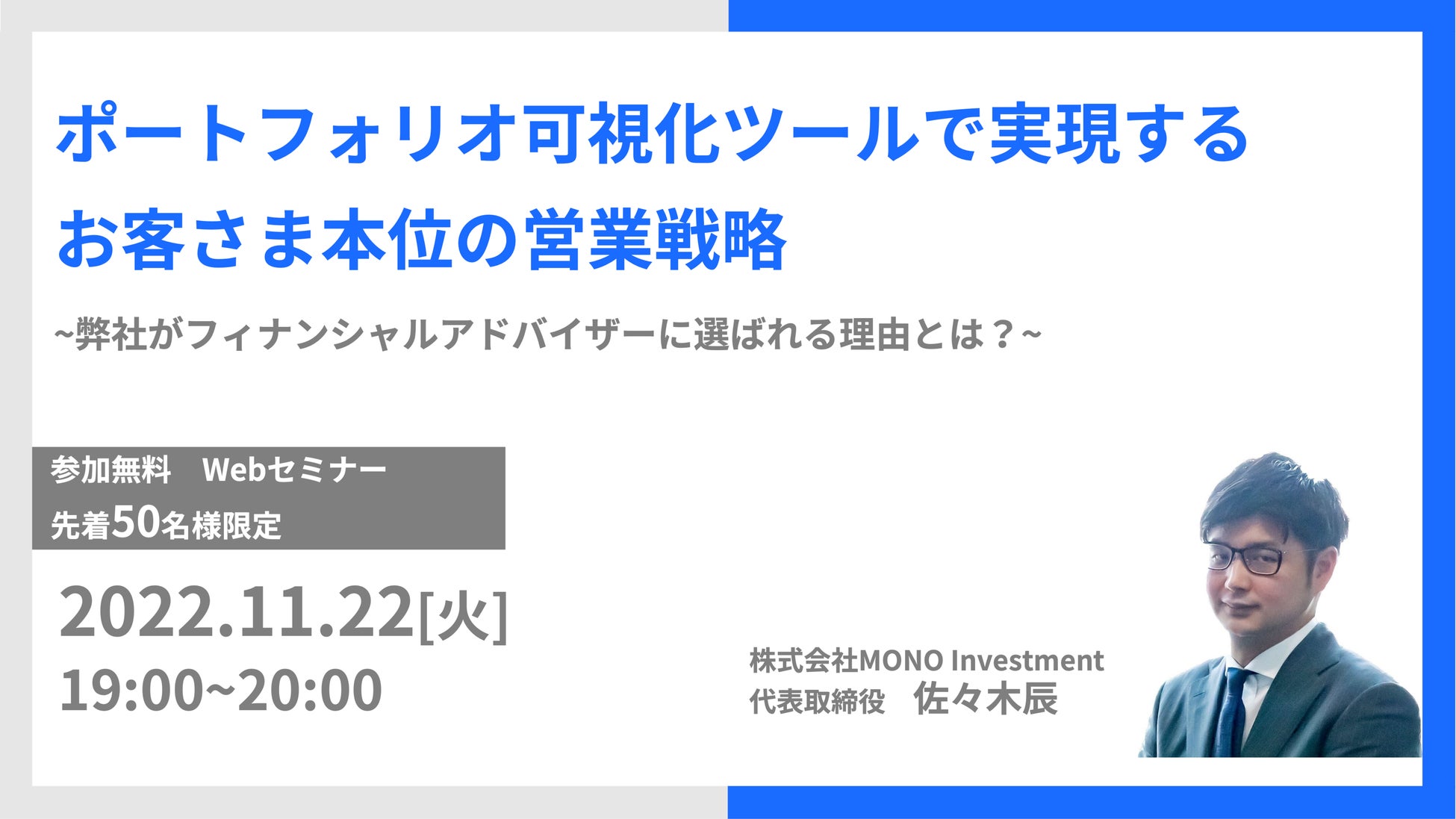 CRMサービス”MONO Investment”の機能や価格等についてご案内させていただくセミナーを開催させていただきます。先着50名となっておりますので、ご関心のあるフィナンシャルアドバイザーの方はぜひお早めにお申し込みください!