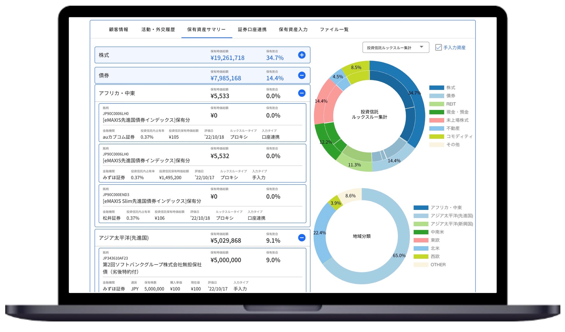 投資信託ルックスルー機能は、個人投資家が保有している金融資産について、投資信託やETF、REITを含め様々な金融商品の資産構成を分析し、アセットクラスや投資地域ごとに分解・分類した上で表示する機能です。本機能を活用することで、お客さまの運用資産を見える化でき、今まで以上に精緻なリスク・リターン分析が可能になります。
