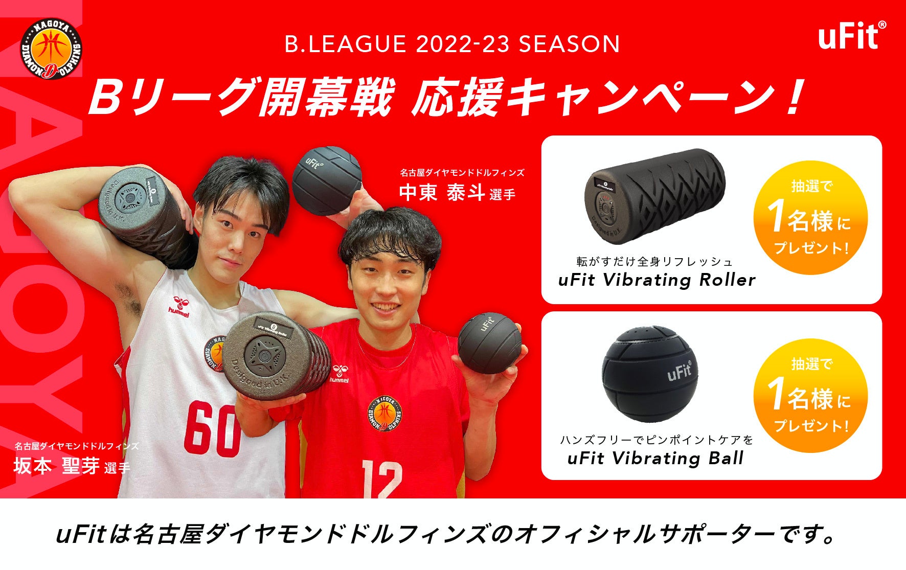 当選した方には選手が愛用する uFit のセルフケアグッズをプレゼント、名古屋Dと三河のサプライヤーを務める uFit と一緒に選手たちを応援しよう