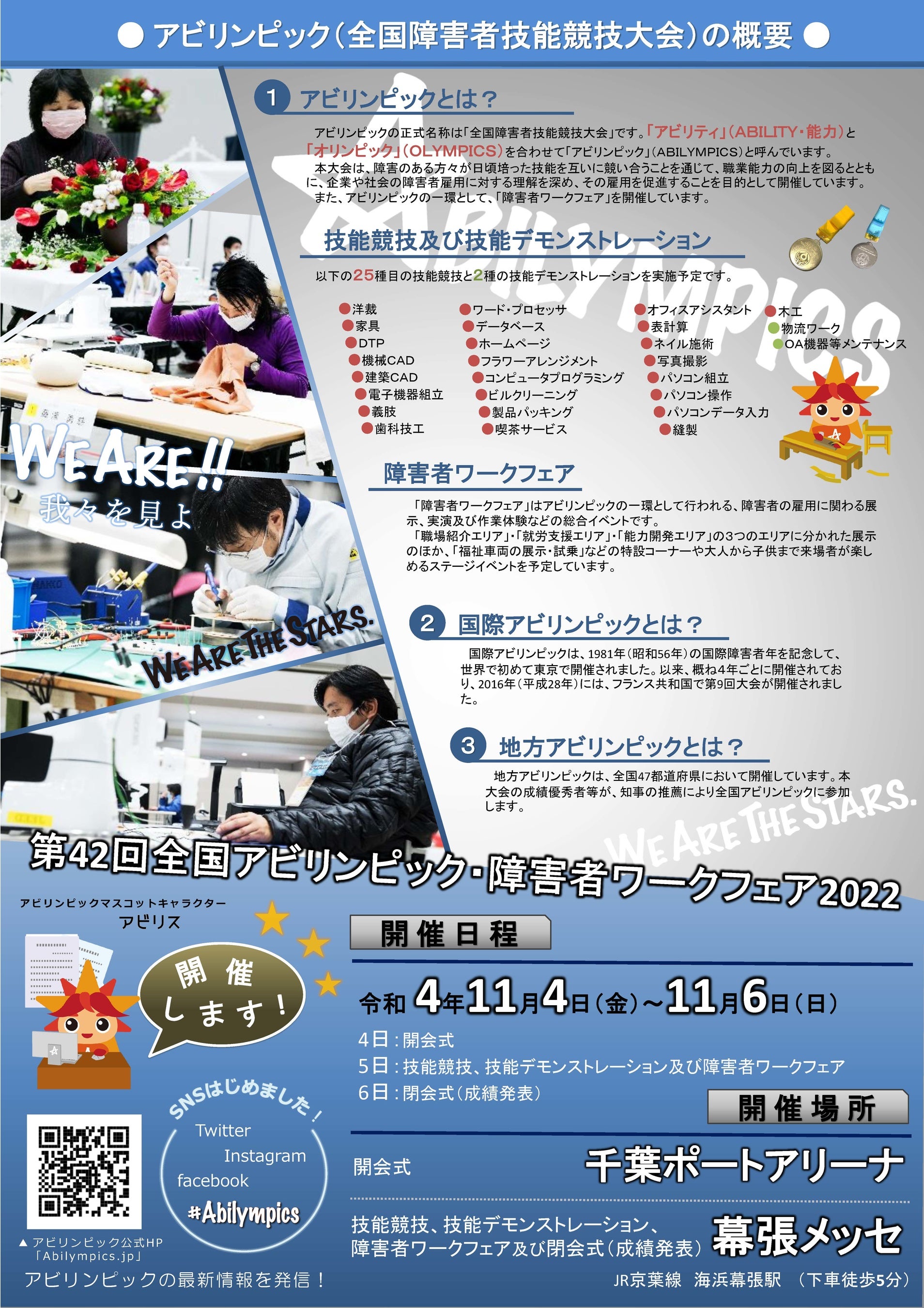 アビリンピックは、独立行政法人高齢・障害・休職者雇用支援機構の主催する障がいのある方々が日々職場などで培った技能を競う大会です。障がいのある方々の職業能力の向上を図るとともに、企業や社会一般の人々に障がいのある方々に対する理解と認識を深めてもらい、その雇用の促進を図る事を目的として開催されています。