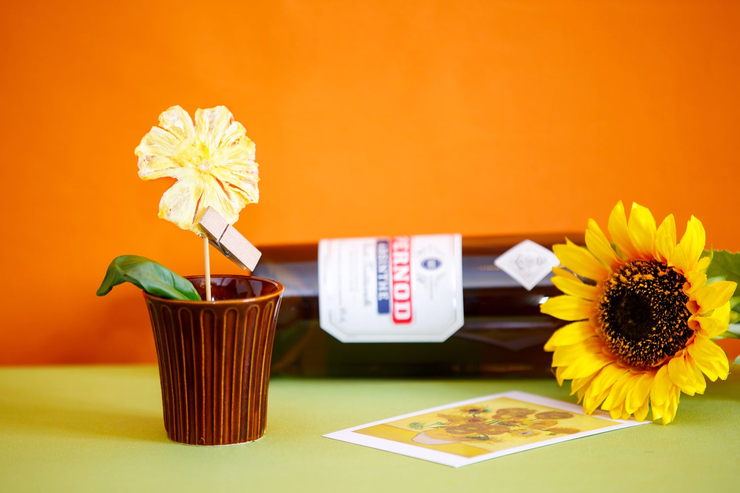 芸術家が愛したお酒として広く普及したアブサンの風味が感じられながらもひまわりの蜂蜜を使用した飲みやすい味。パッと見はまるでひまわりの植木鉢のようです。