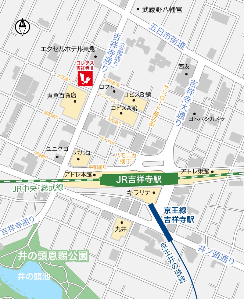 「『コレタス吉祥寺Ⅱ』は、吉祥寺公園通りに建つテナントビルです。周辺には数々の商店街があり、公園や神社・お寺の緑が豊かに広がっています。