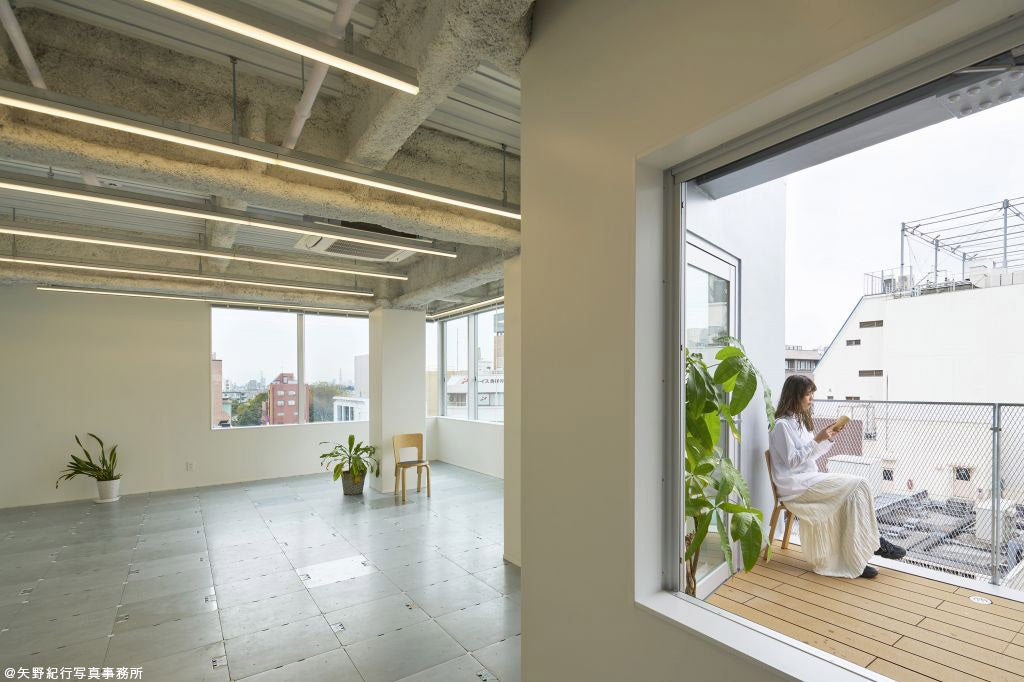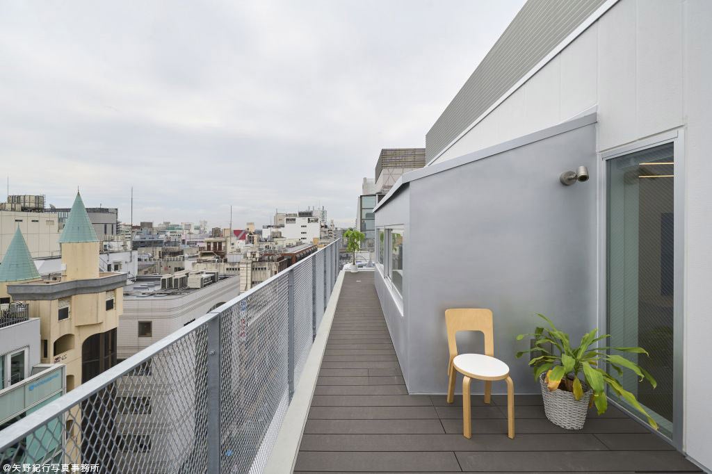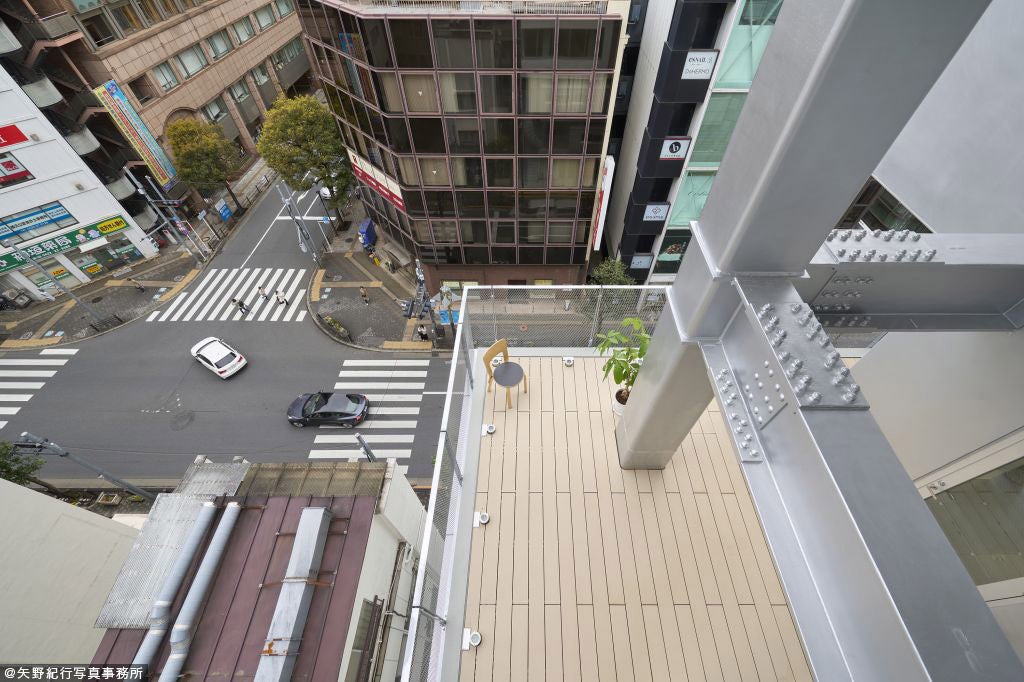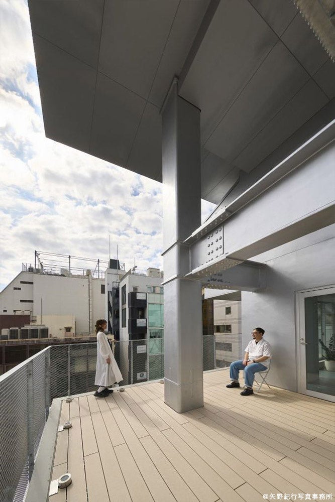 建物の大きな特徴は、吉祥寺公園通りに面してランダムに設けた広々としたテラスです。そして、このテラスにつながる通路を建物の外観に沿うように配置しています。このテラスにより、建物を使う人たちが環境の良さを存分に感じることができます。
