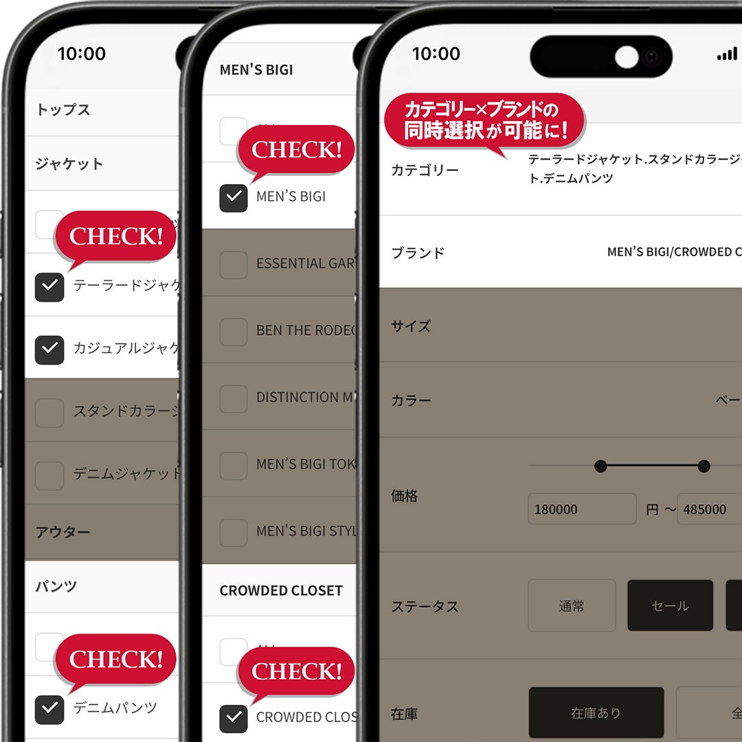 絞り込み条件画面で、ブランド・カテゴリ・サイズ・色などの同時絞り込み機能が追加。欲しいアイテムをよりスムーズに見つけられるようになりました。