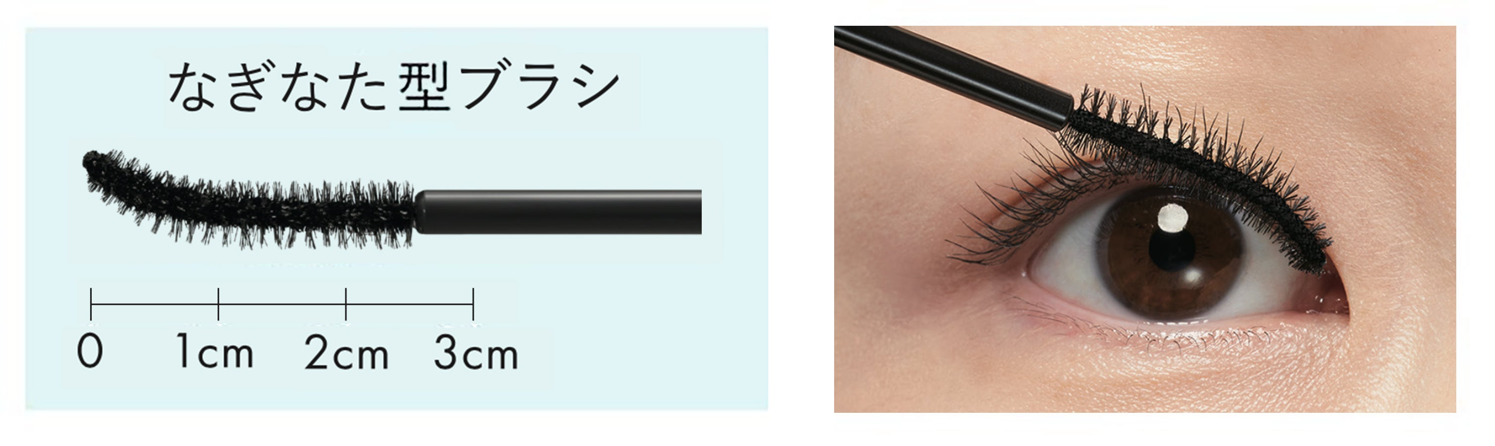 〈なぎなた型ブラシ〉を採用。ブラシ先端部のゆるやかなカーブが、まぶたに隠れたまつげの根もとにグッと入り込むため、目頭から目尻までの毛を残さずに塗ることができます。