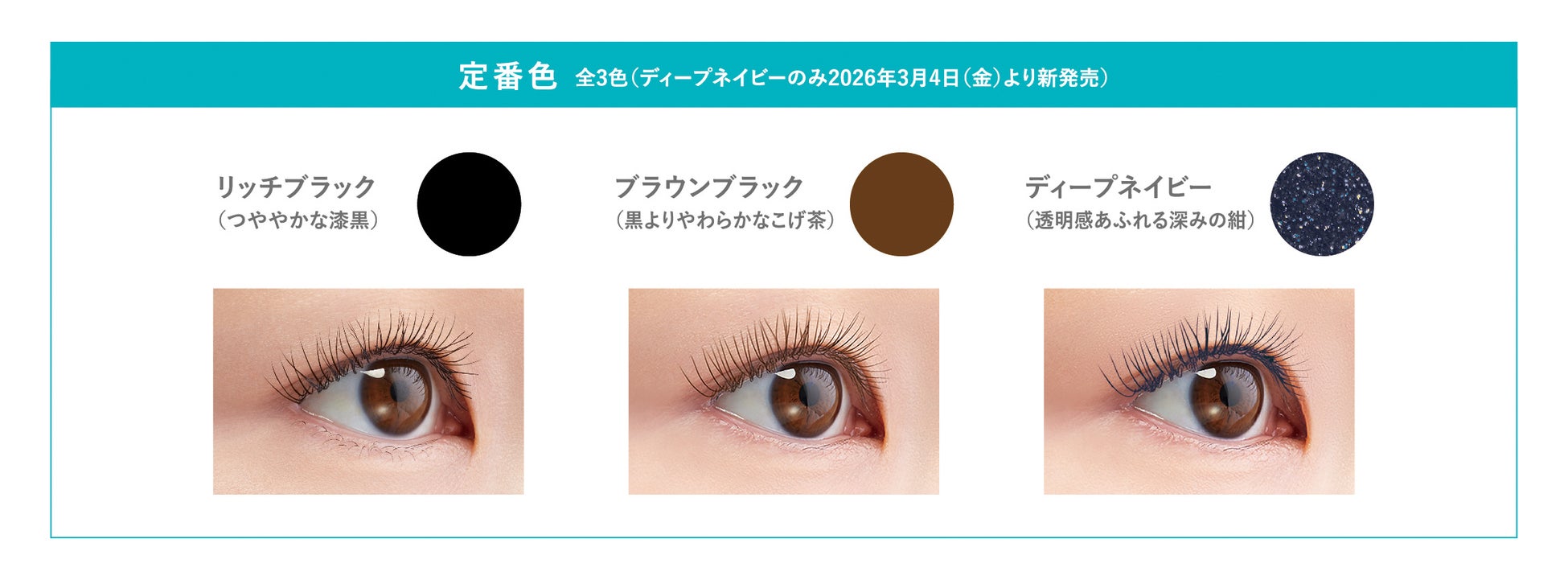 深みのあるブルーのベースカラーを採用。顔料の割合を減らしパールに置き換えることで、透け感のある発色を実現。重たい印象にならずに1本1本のまつげをクッキリと見せます。