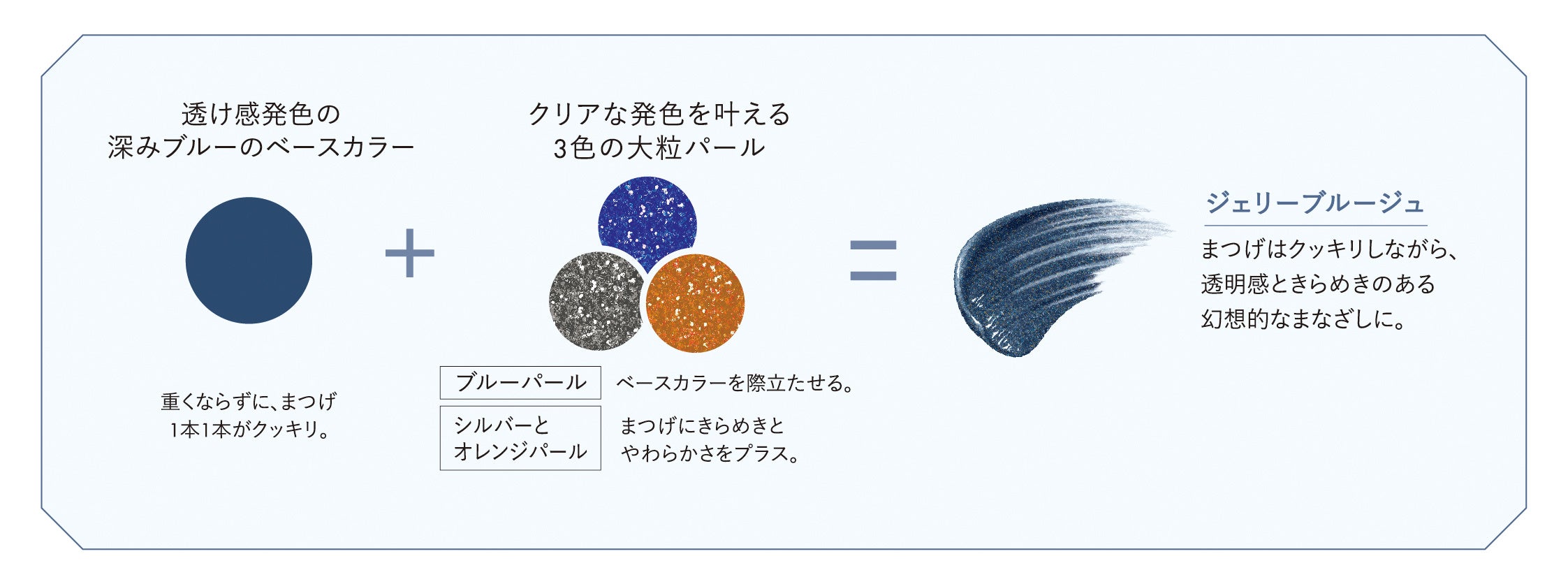 深みのあるブルーをベースに、顔料を抑えてパールを高配合。透け感のある発色で、目もとが重たくならず、まつげ1本1本をクッキリと引き立てます。ブルー・シルバー・オレンジの3色の大粒パールをブレンドすることで、白くくすみがちなまつげもクリアな印象に。ブルーパールがベースカラーを際立て、シルバーとオレンジのパールがきらめきとやわらかさを添え、ピュアで繊細な仕上がりに。まつげをクッキリと見せながらも、透明感ときらめきをまとった、幻想的なまなざしに仕上げます。