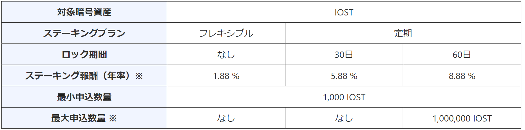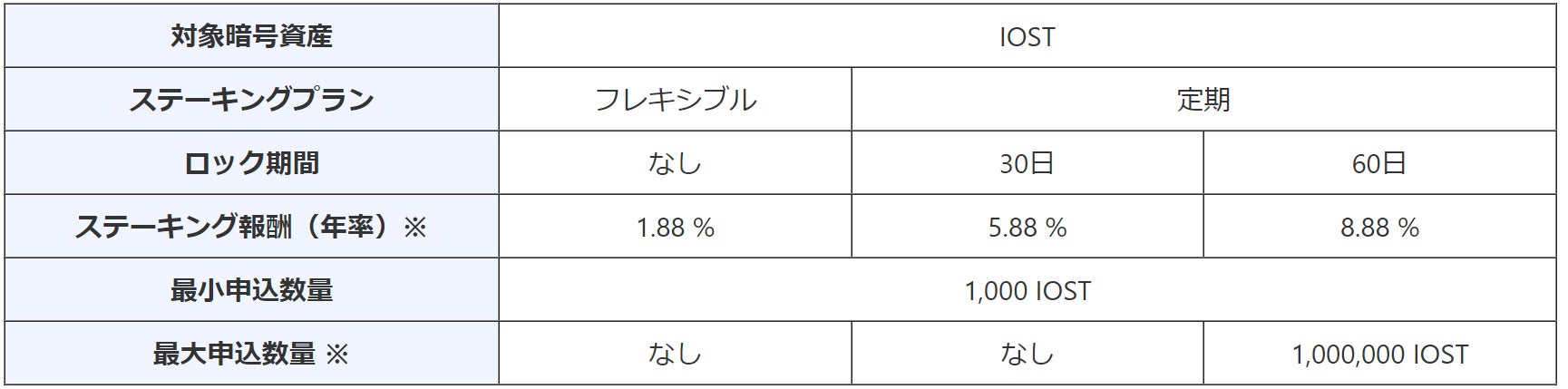 IOSTのステーキングでは、ロック期間の制限がない「フレキシブル」プランと、30日・60日のロック期間がある「定期」プランをご用意。60日の定期プランでは、年率8.88%のステーキング報酬を得ることができます。