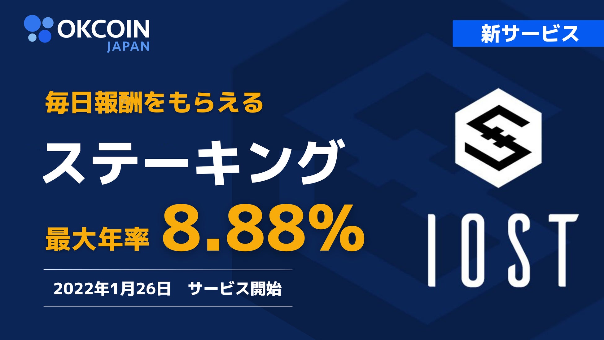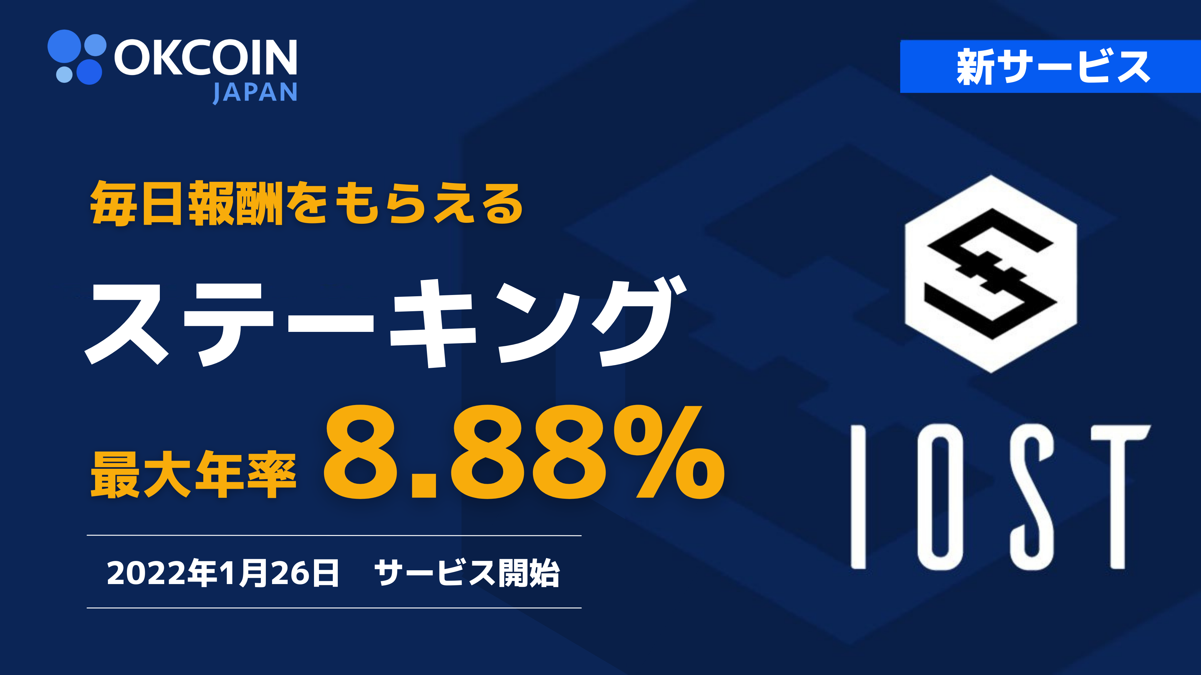 当社は、OKCoinJapan(暗号資産取引所)にて、アイオーエスティー(IOST)を対象とした「ステーキング」サービスを、2022年1月26日(水)より提供開始することをお知らせいたします。