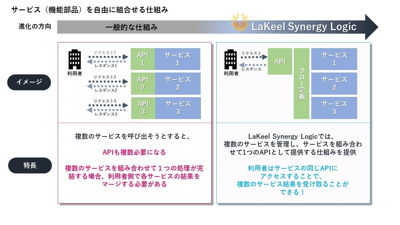 通常、あるソフトウェアから他のソフトウェアにサービスをリクエストし、それをレスポンスするというのが一般的ですが、今回特許を取得しました「LaKeel Synergy Logic」は司令塔のような役割を果たし、リクエスト内容から必要なサービスを探し出すことができます。また、登録されたサービスを組み合わせて新たなサービスを作り出すことが可能になります。登録されたサービス(API)に対して、本体のソースコードの修正をせずに、新たな機能・動作を追加できるため、既存の開発のあり方が大きく変わる技術になります。マイクロサービス・APIエコノミーが世界に急速に広がりつつある時代に、この新技術は社会に貢献できるものだと考えております。