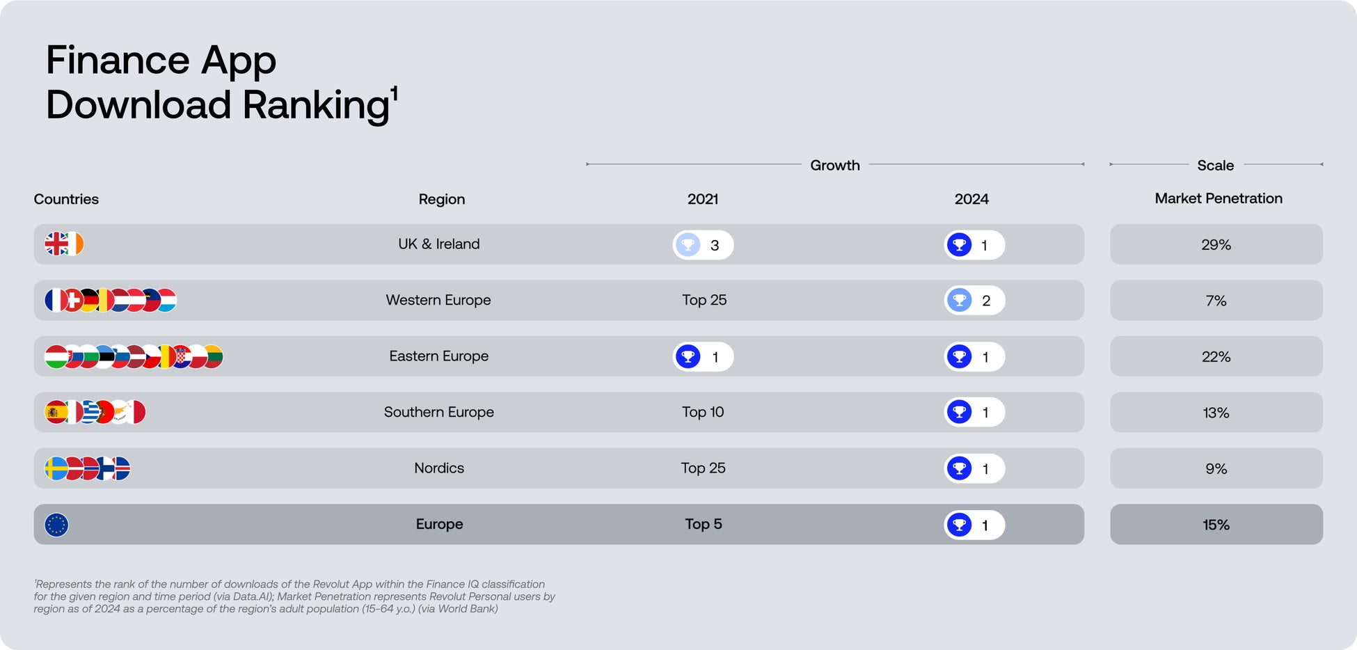 市場でのリーダーシップとリーチ:欧州全域で強い成長の勢いを見せ、現在Revolutはファイナンスカテゴリーで最もダウンロードされたアプリであり、19カ国で第1位、欧州大陸の26カ国でトップ3にランクインしています。