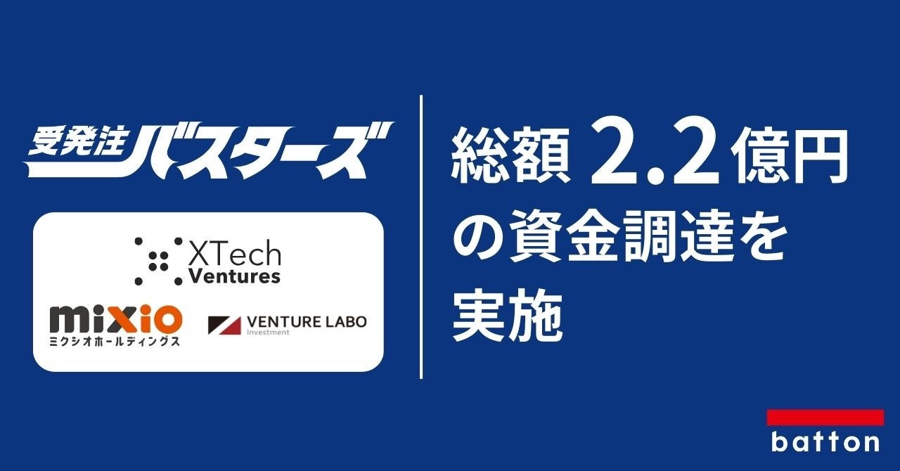 プレシリーズAラウンドにおいて、XTech Ventures株式会社(東京都中央区)およびミクシオホールディングス株式会社(広島県広島市)及び株式会社ベンチャーラボインベストメント(東京都中央区)から総額2.2億円の資金調達を行いました。これにより、当社は『受発注バスターズ』のAI機能のさらなる強化、さらなるバージョンアップに向けて加速していきます。